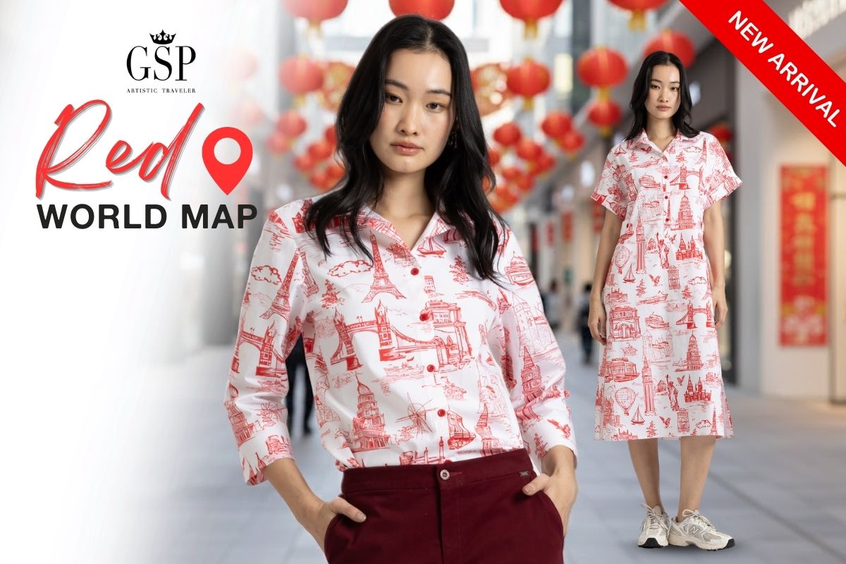 GSP Woman’s shirt Red world map longsleeve Red | เสื้อเชิ้ตผู้หญิง เรด เวิลด์ แมพ แขนสามส่วน สีแดง PCDJRE
