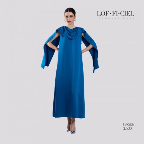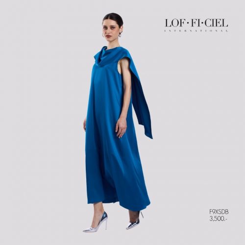 LOF-FI-CIEL Dress Silk Satin | เดรสยาว แขนกุด ผ้าคลุมไหล่ ทรงหลวม สีน้ำเงิน F9XSDB