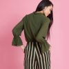 กางเกงขายาวเอวสูง ทรงบาน ลายทางสีเขียวและเบจ | Jousse JR42DR