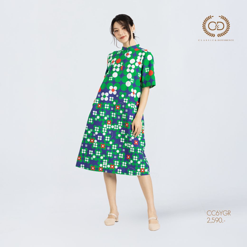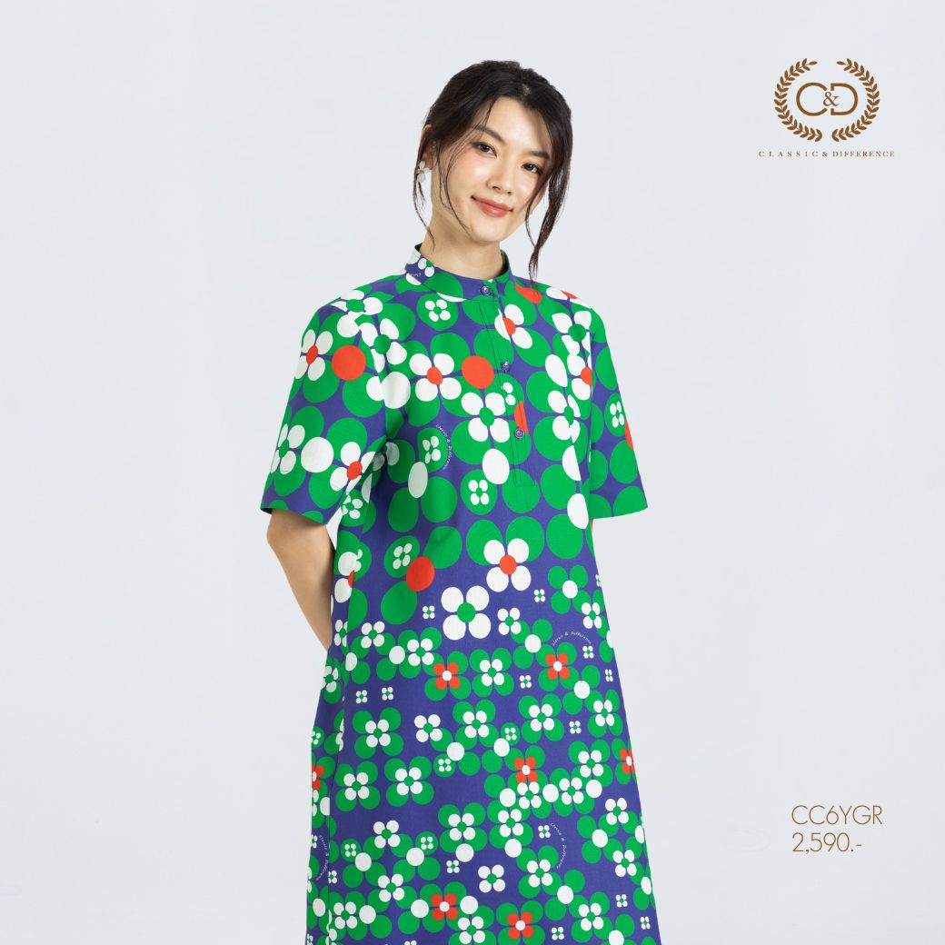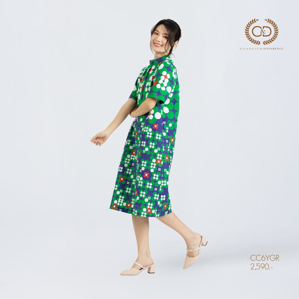 เดรส C&D Dot Flowers Green ทรงตรง คอตั้ง แขนสั้น ดีไซน์กระดุมหน้าถึงช่วงเอว เพิ่มความเรียบร้อยและสวมใส่ง่าย ผลิตจากผ้าคอตตอน 100% พิมพ์ลาย Dot Flowers สีเขียว ให้สัมผัสนุ่ม ระบายอากาศได้ดี เหมาะสำหรับลุคประจำวัน ลุคท่องเที่ยว และสไตล์สปอร์ต สำหรับผู้หญิง