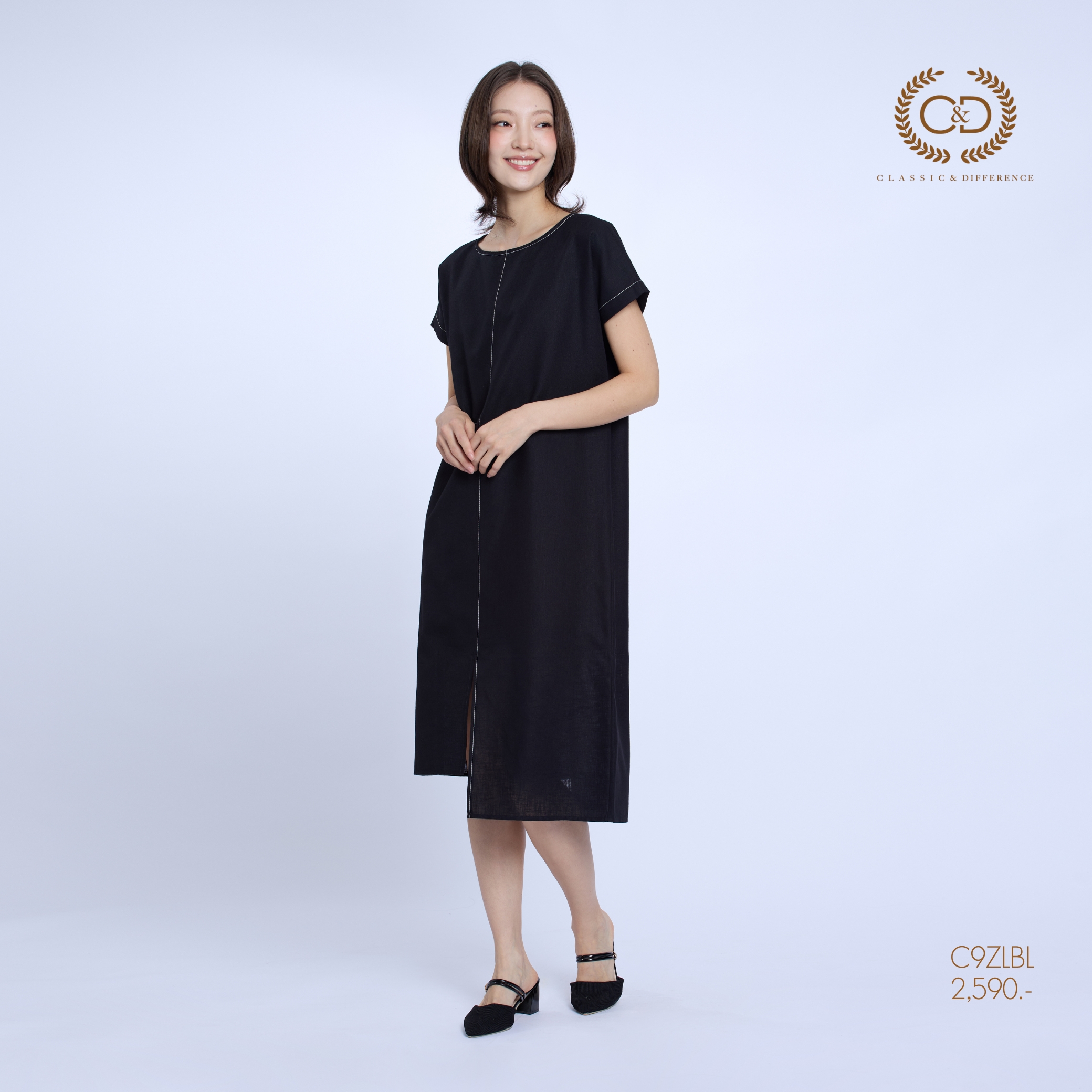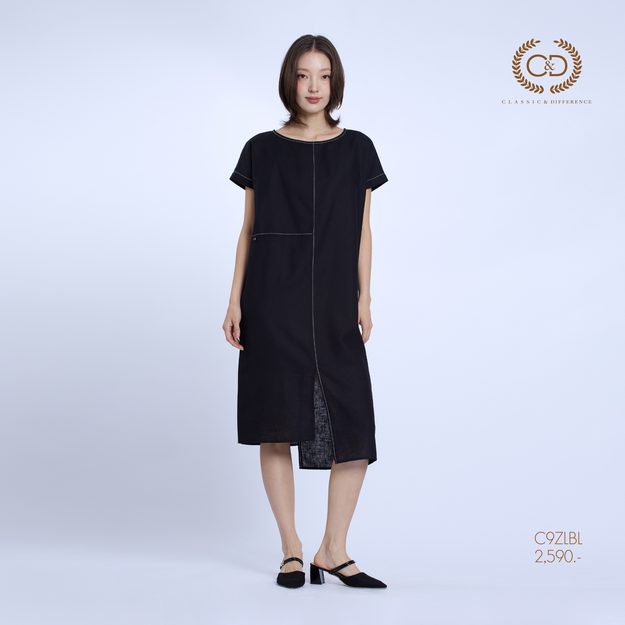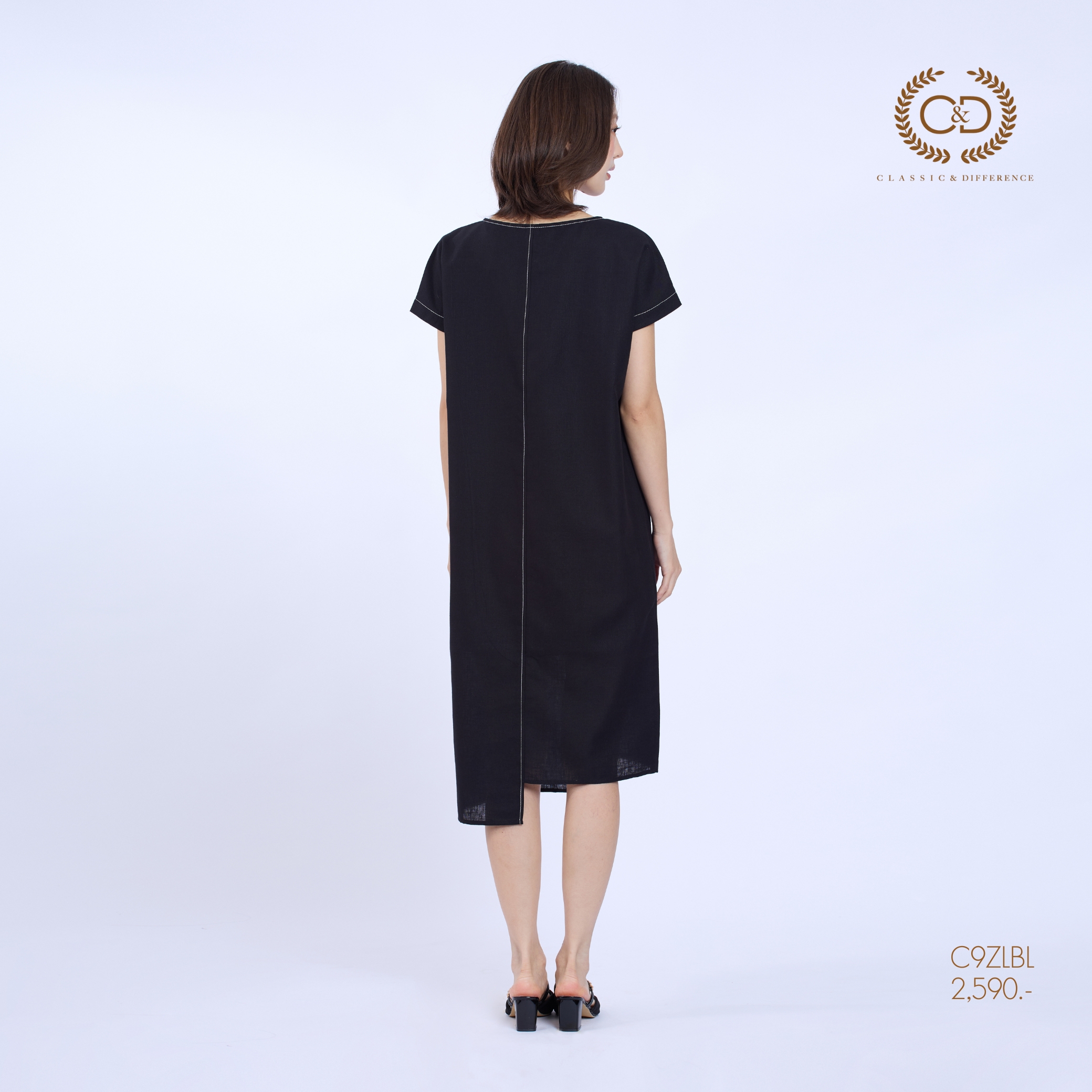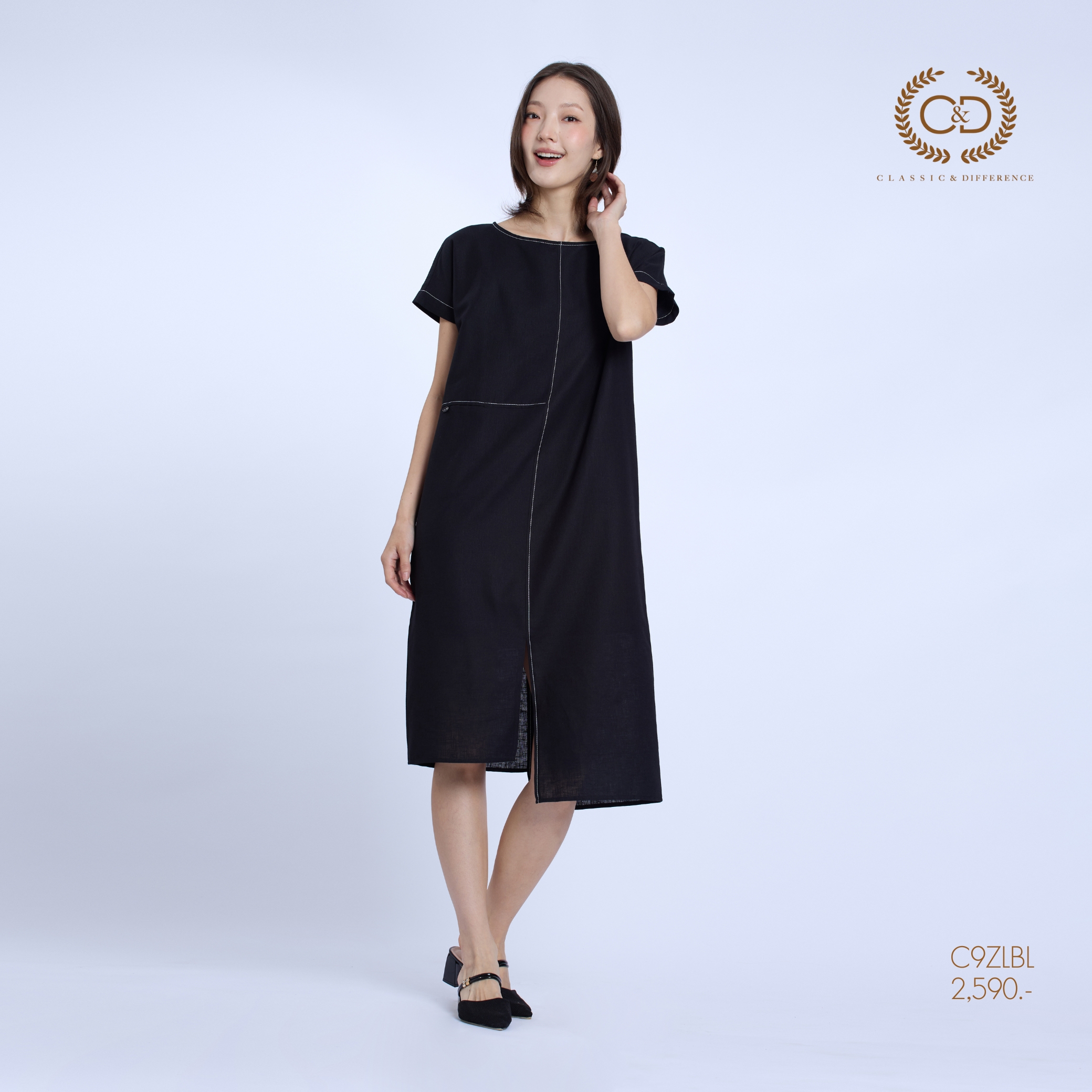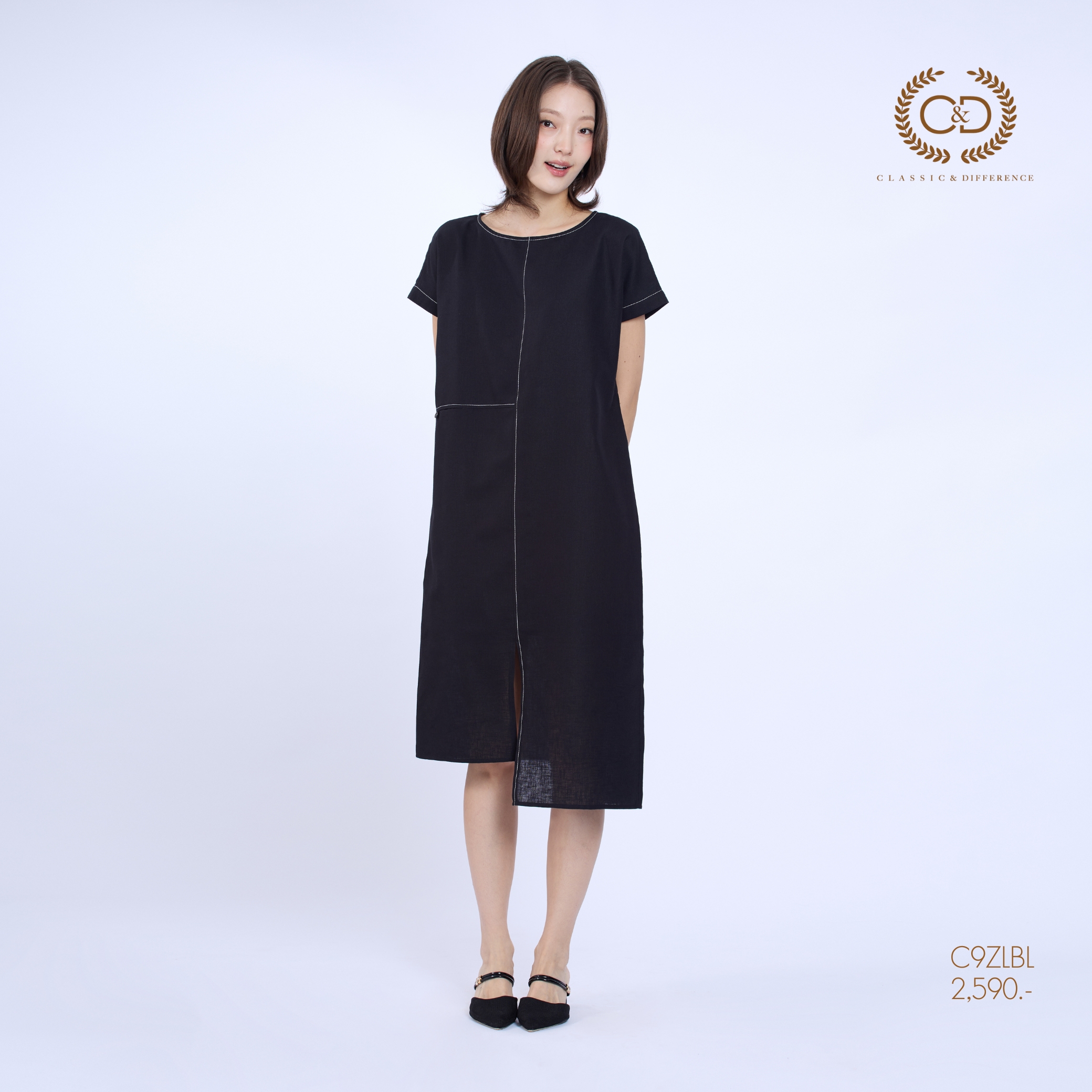 C&D Dress Linen Fusion | เดรสคอกลม แขนสั้น สีดำ C9ZLBL