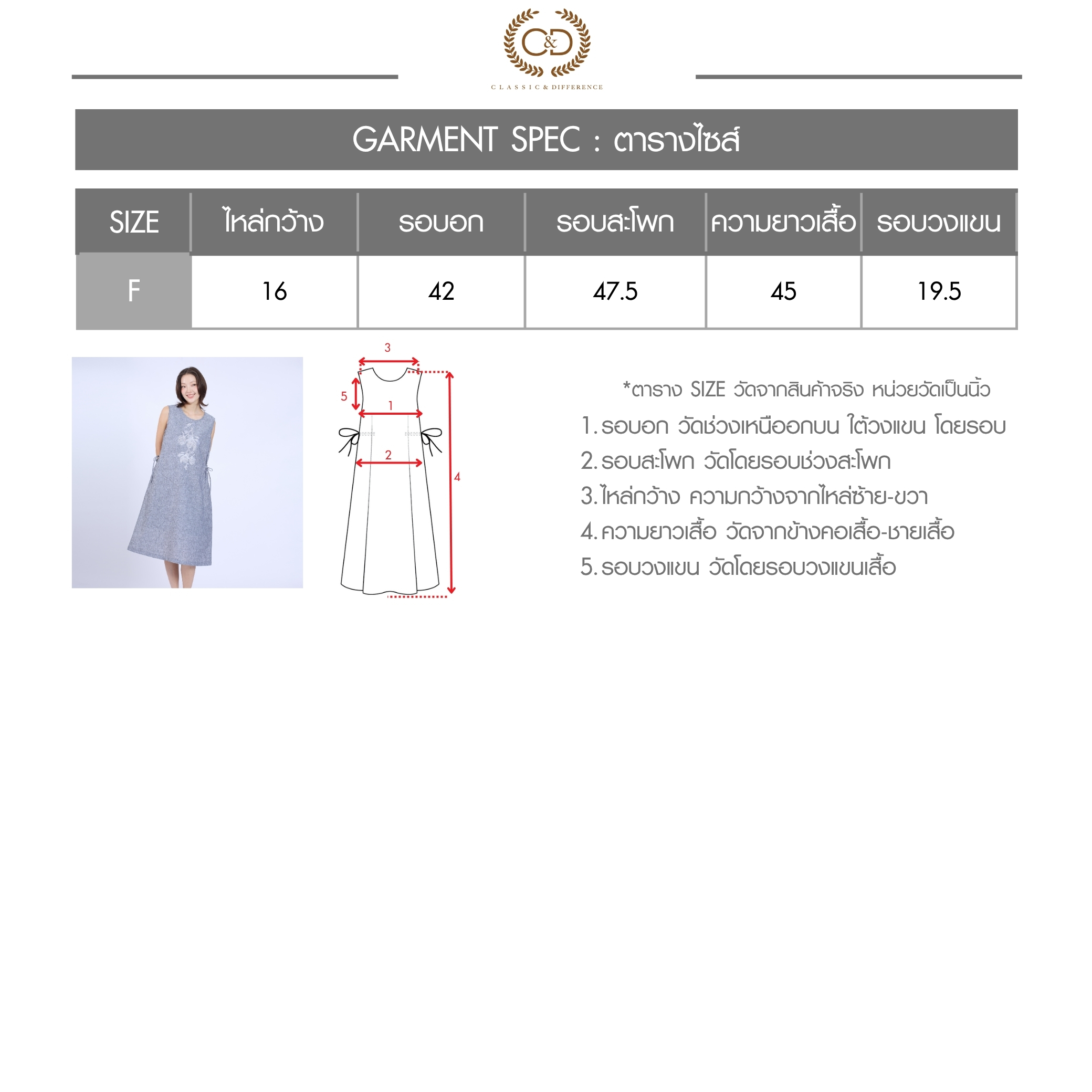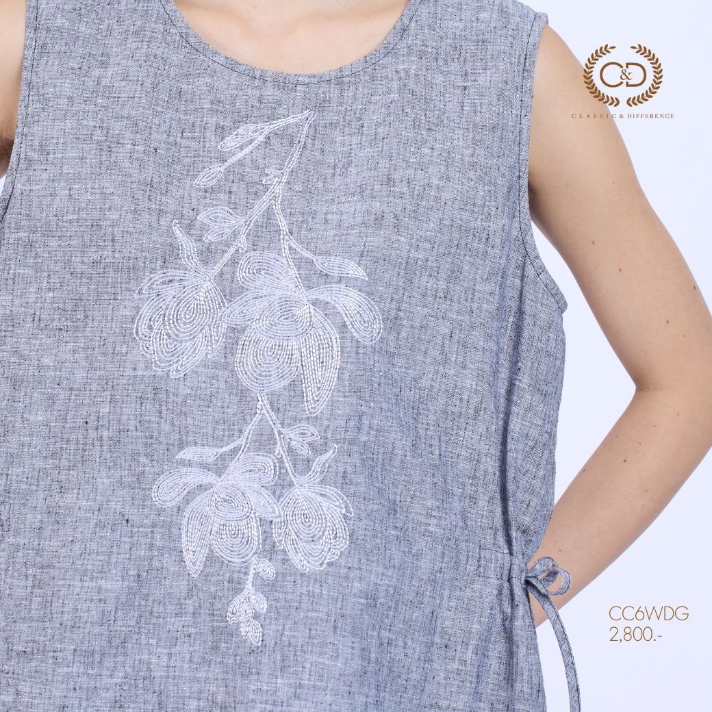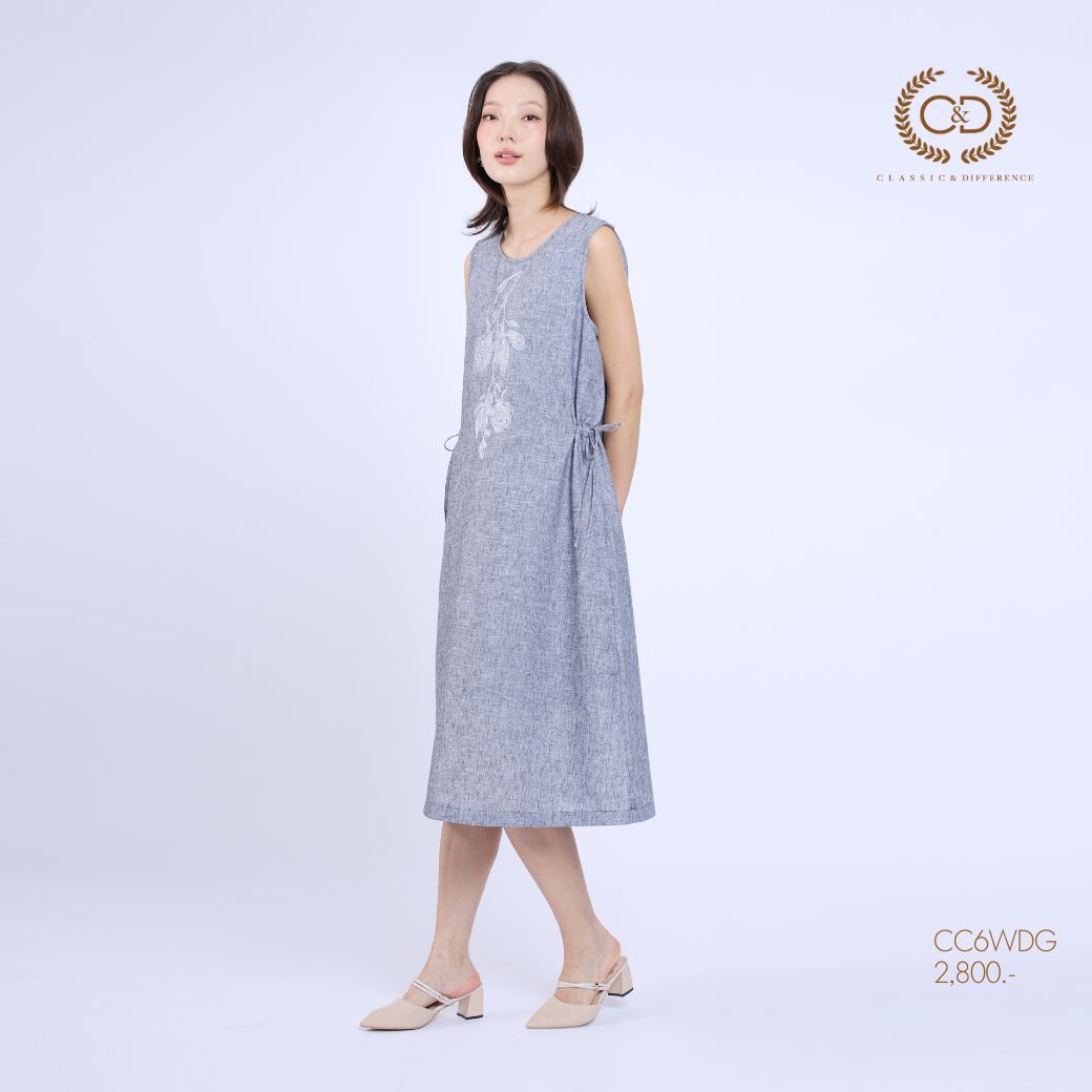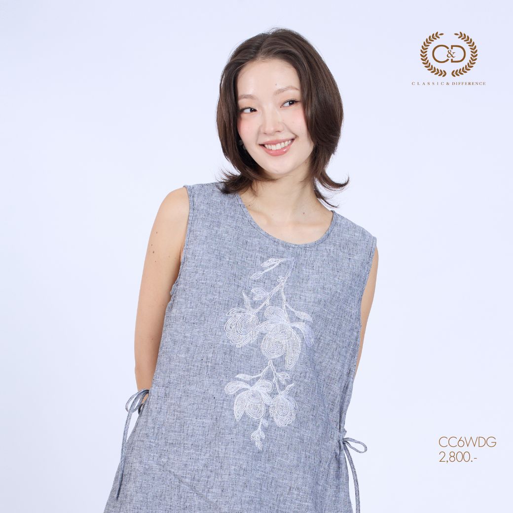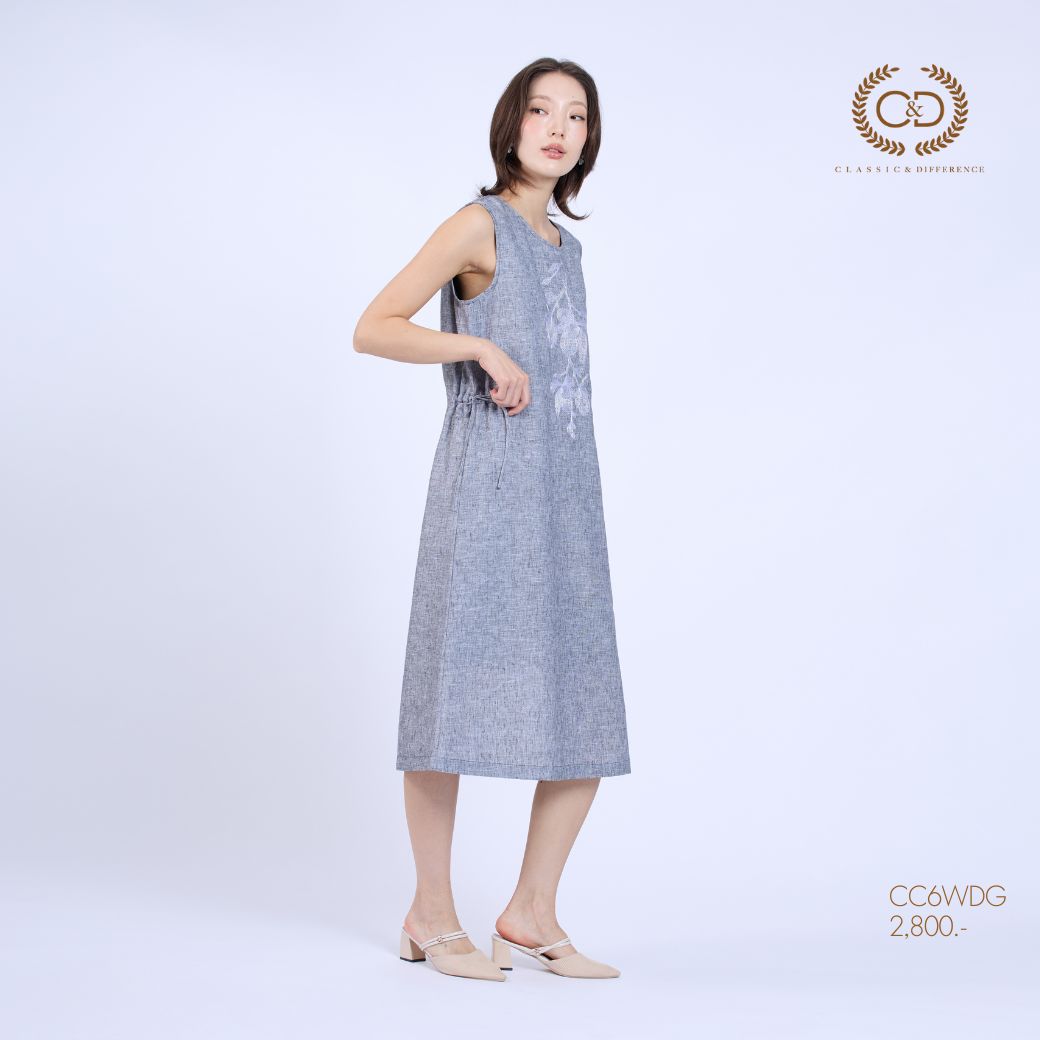 เดรส C&D Linen Fusion สีเทา ผลิตจากผ้าโพลีเอสเตอร์ผสมลินิน เนื้อสัมผัสเบาและสวมใส่สบาย ดีไซน์คอกลม แขนกุด ทรงเอบานเพิ่มความพลิ้ว พร้อมเชือกรูดข้างเอวปรับได้ตามต้องการ ตกแต่งลายปักดอกไม้เพิ่มความอ่อนหวาน เหมาะสำหรับวันพักผ่อนหรือทริปท่องเที่ยวในลุคมินิมอลห