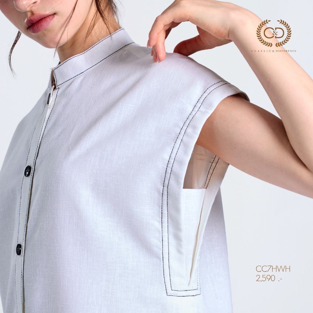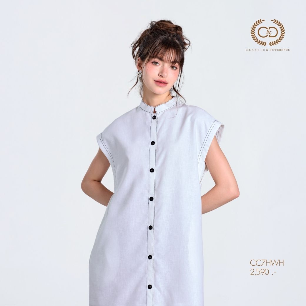 เดรสยาว C&D Linen Fusion White Dress สีขาว ผลิตจากผ้าโพลีเอสเตอร์ 80% ผสมลินิน 20% เนื้อผ้าเบา ระบายอากาศได้ดี ดีไซน์คอตั้ง แขนเลย พร้อมชิ้นผ้าใต้วงแขนช่วยเพิ่มความมั่นใจ มาพร้อมกระดุมผ่าด้านหน้า สวมใส่ง่าย ให้ลุคสะอาดตาและทันสมัย เหมาะสำหรับวันพักผ่อน ท่องเที่ยว และสไตล์แคชชวล