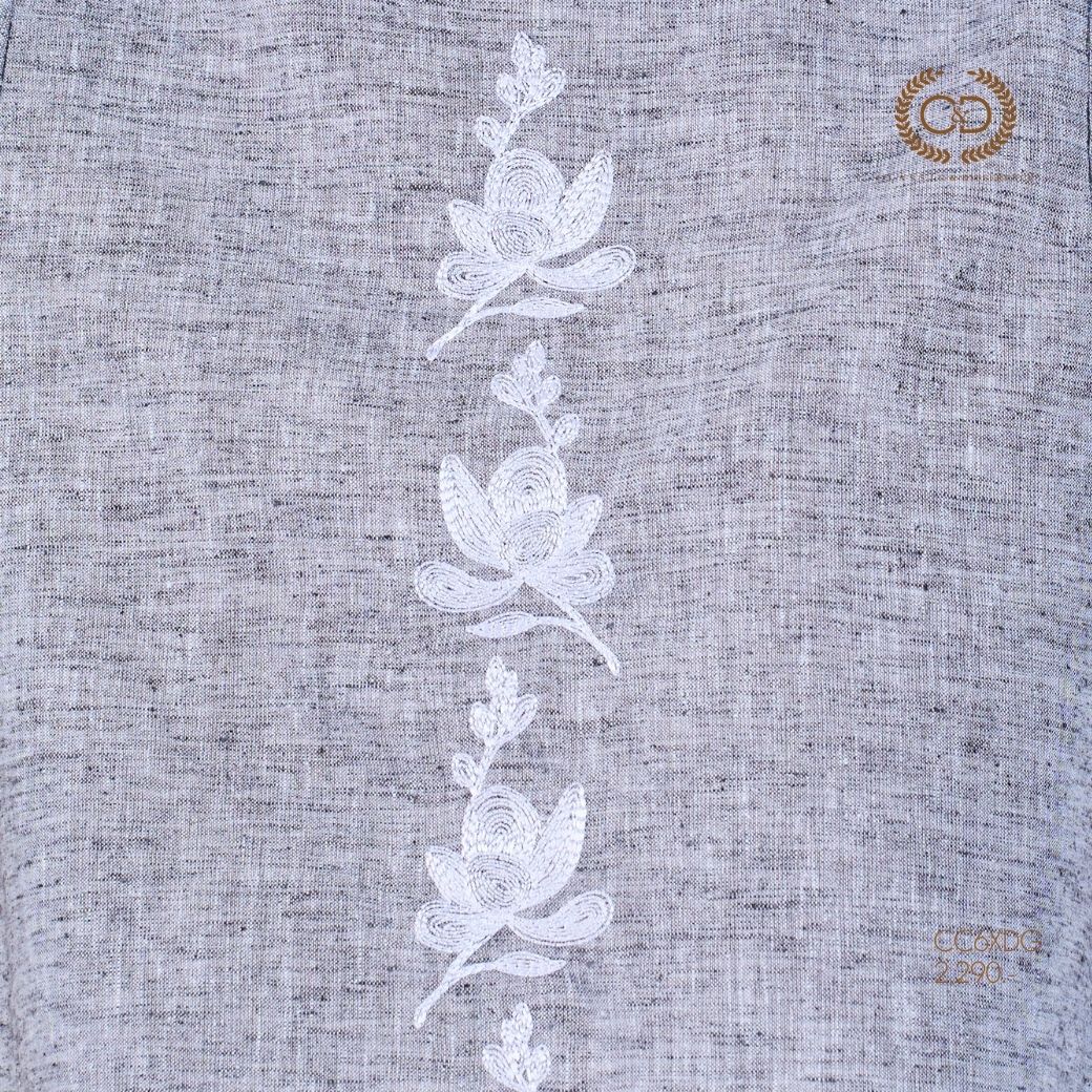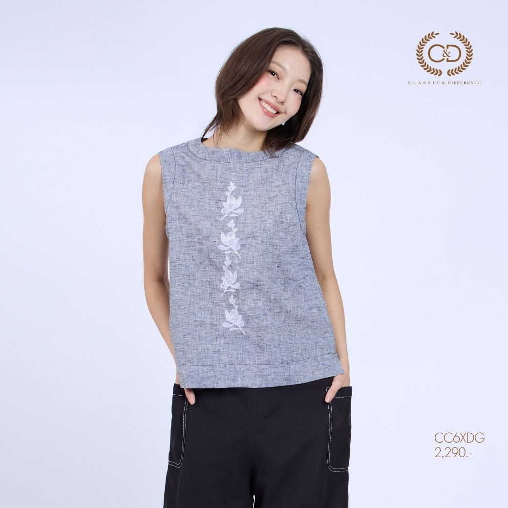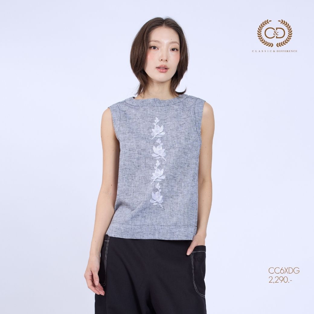 เสื้อผู้หญิง C&D Linen Fusion สีเทา ผลิตจากผ้าโพลีเอสเตอร์ผสมลินิน เนื้อสัมผัสนุ่มและโปร่งสบาย ดีไซน์คอตั้ง แขนกุด เจาะกระดุมคอหลัง เพิ่มความโดดเด่นด้วยงานปักลายดอกไม้ประณีต สวมใส่ง่าย เข้ากับทุกโอกาส เหมาะสำหรับวันพักผ่อนหรือวันเที่ยวในลุคมินิมอลทันสมัย