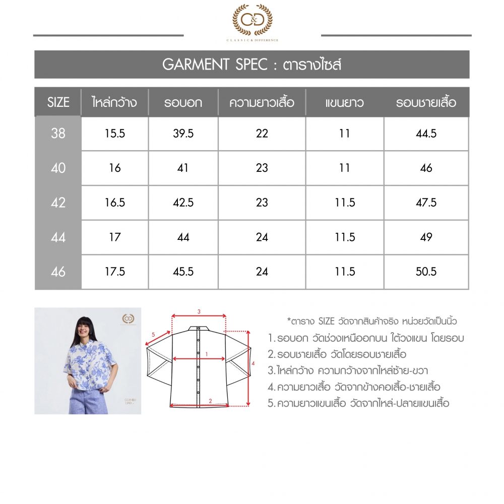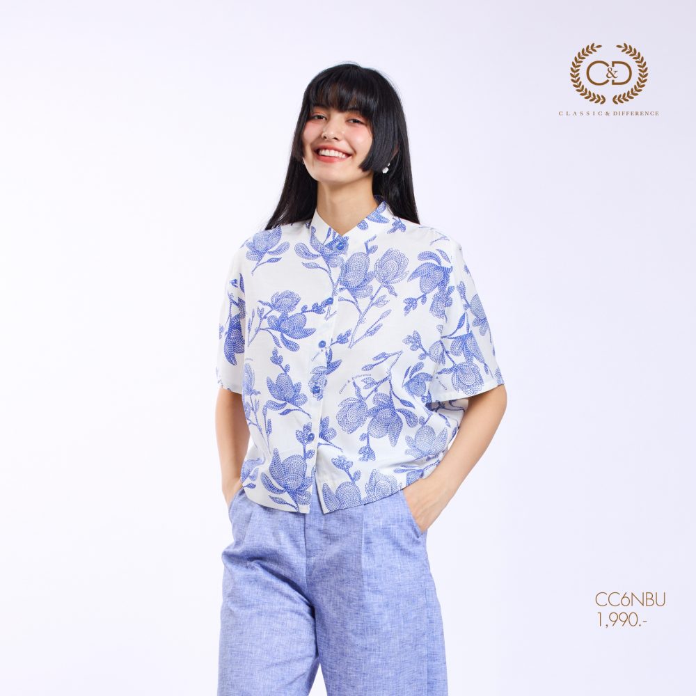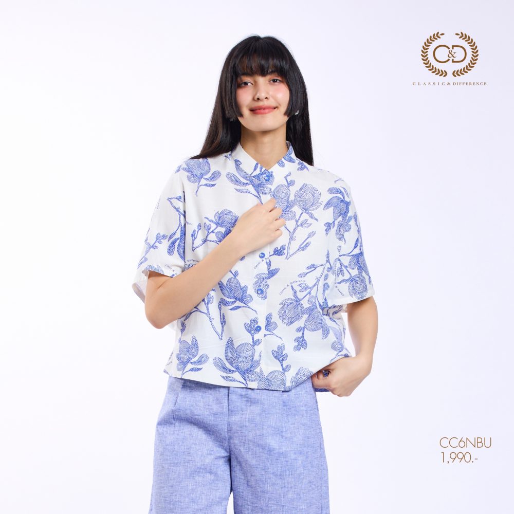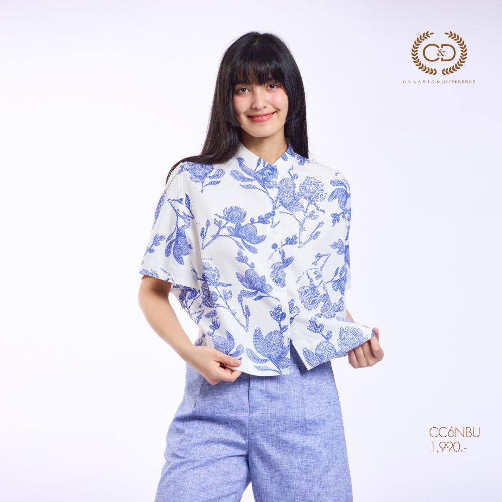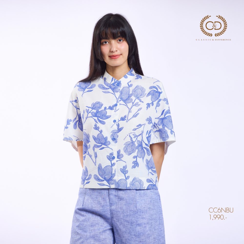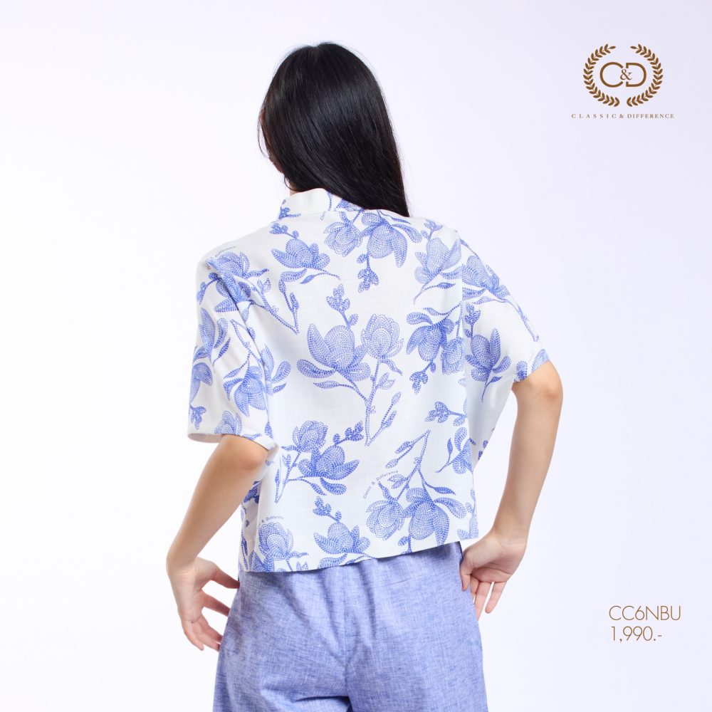 เสื้อผู้หญิง C&D Blue Flower Stitch คอตั้ง ผลิตจากผ้าคอตตอน 52% และเรยอน 48% ให้สัมผัสนุ่มสบาย ระบายอากาศได้ดี ดีไซน์คอจีนทันสมัย แขนโอบ วงแขนในตัว เพิ่มความคล่องตัวในการสวมใส่ โดดเด่นด้วยลายพิมพ์ Blue Flower Stitch ที่ช่วยเสริมลุคให้ดูอ่อนหวานและมีสไตล์