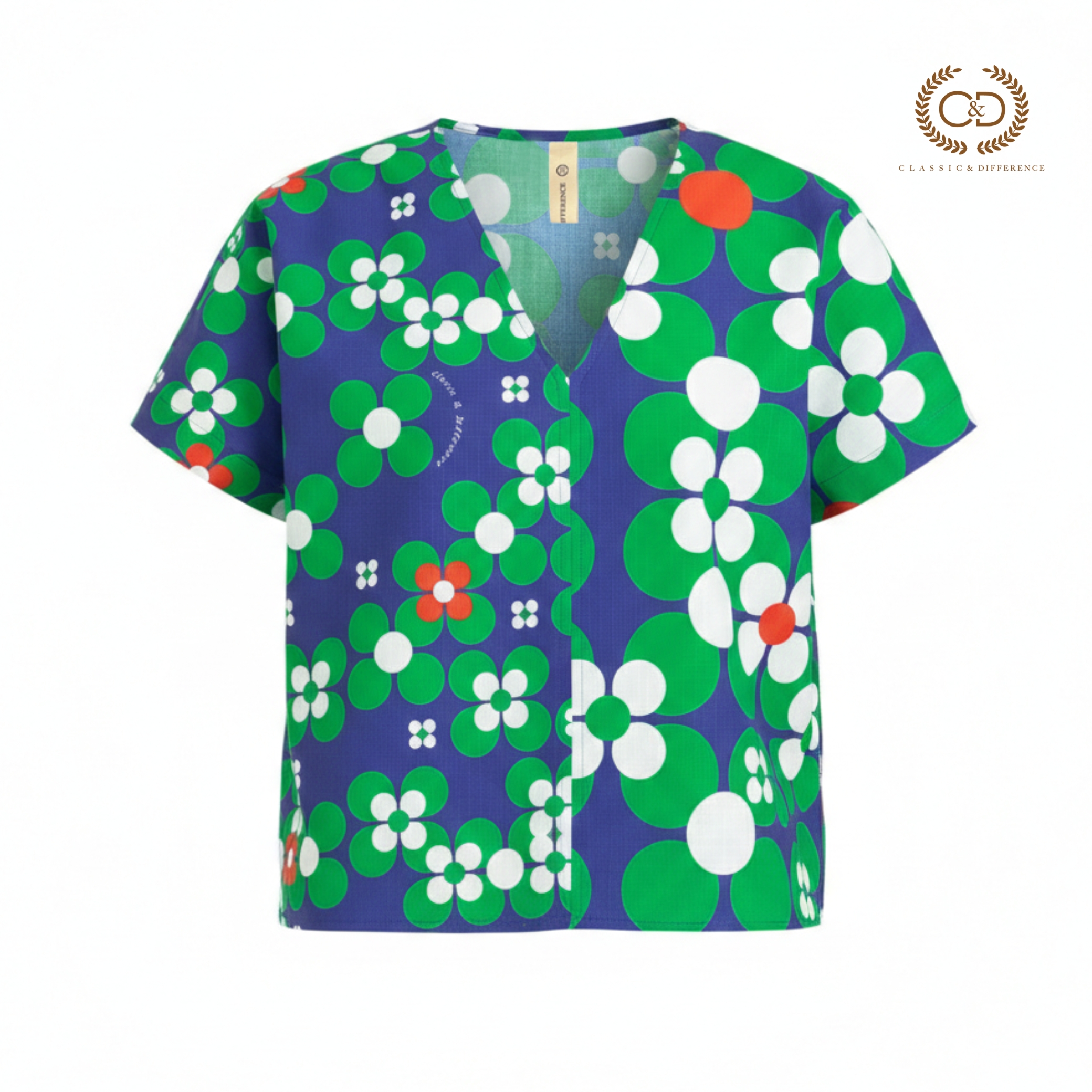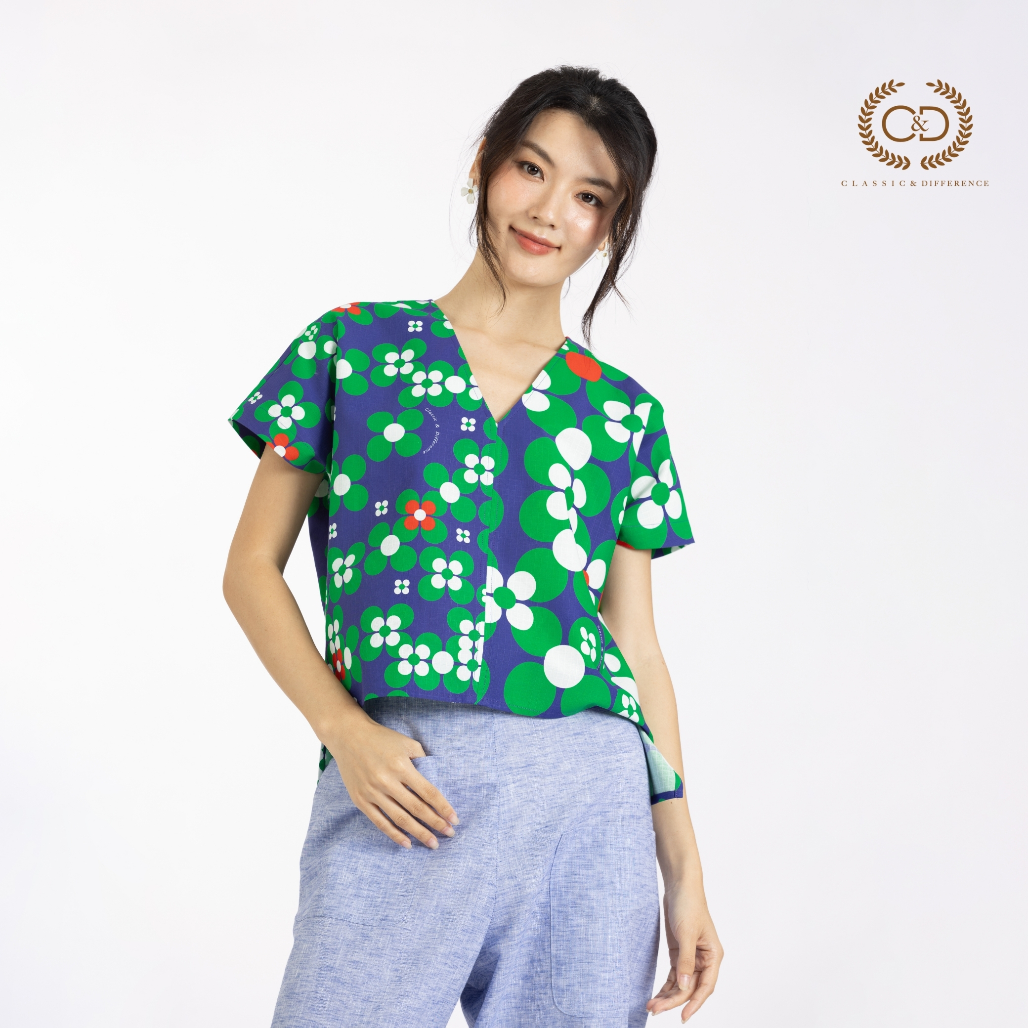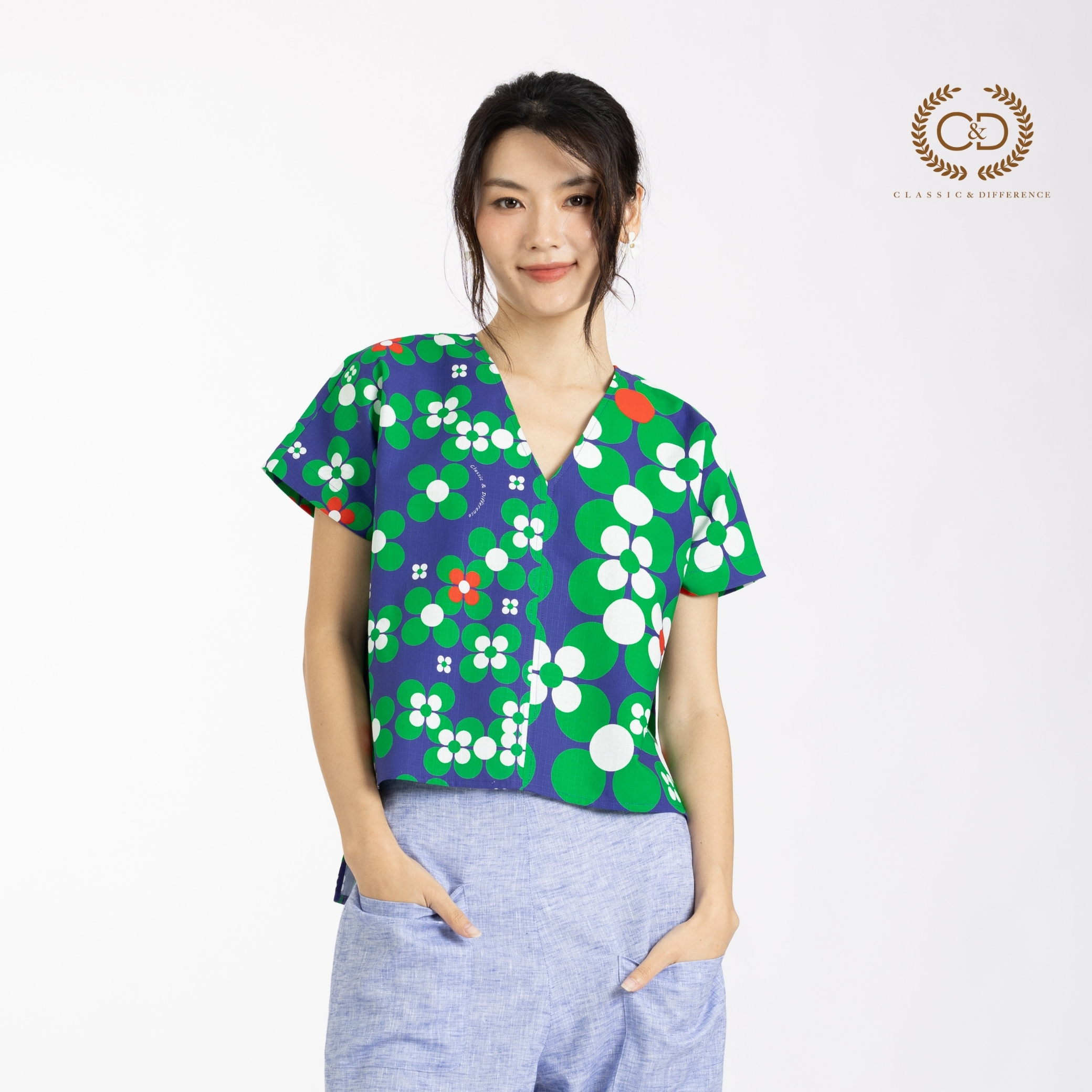 C&D Woman’s blouse Dot flowers Green Short sleeve Green | เสื้อผู้หญิง ดอท ฟลาวเวอร์ กรีน คอวี แขนสั้น สีเขียว CC71GR
