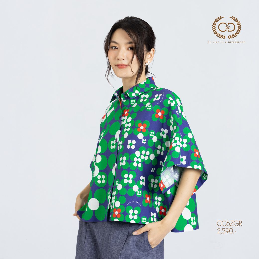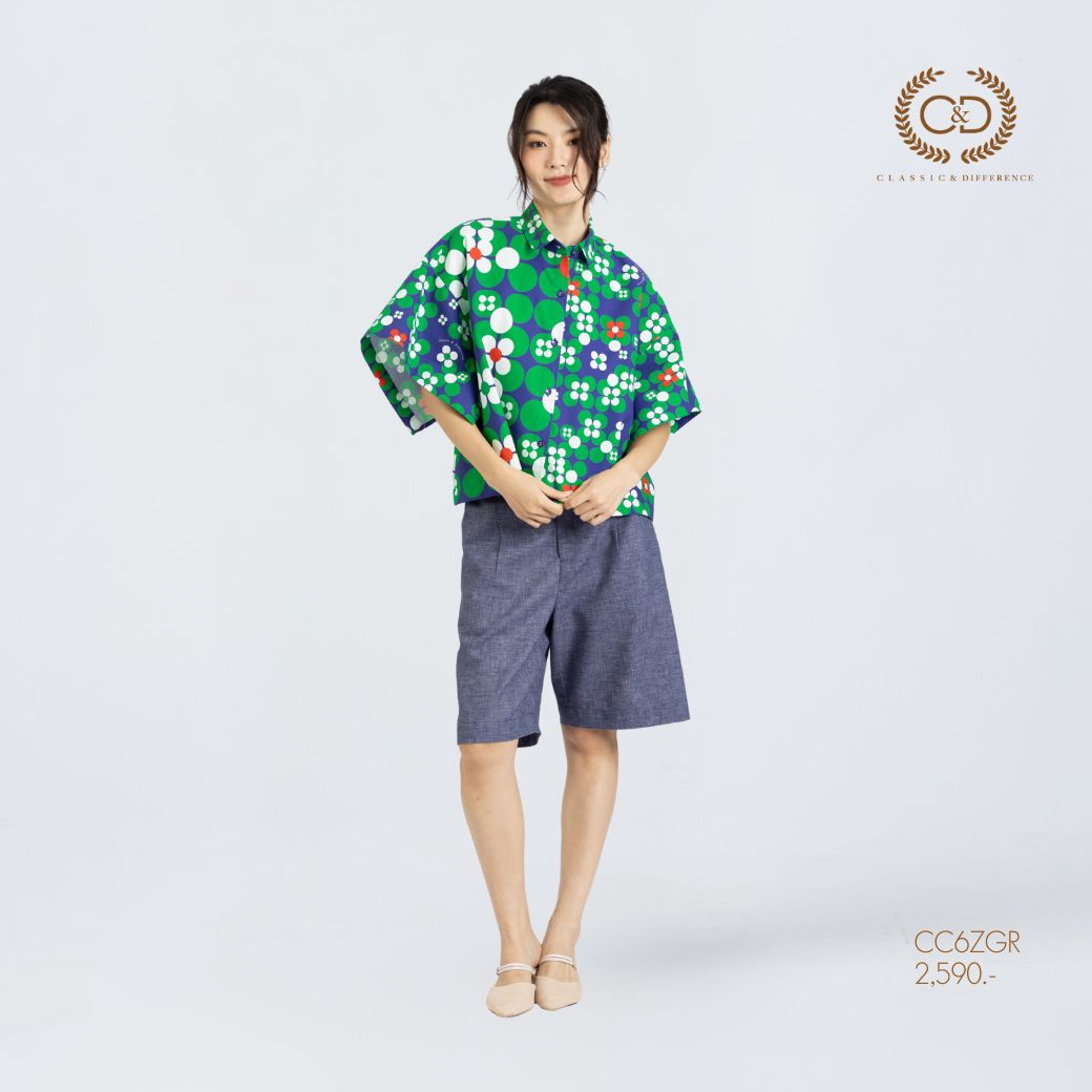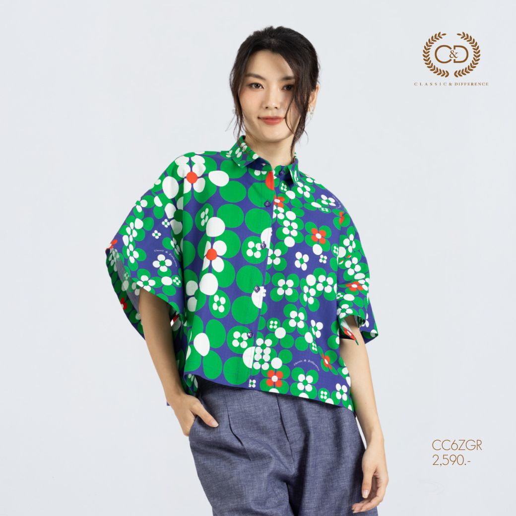 เสื้อผู้หญิง C&D Dot Flowers Green แขนสั้น ดีไซน์คอปกเชิ้ต แขนทรงกิโมโนขนาดใหญ่ทรงสี่เหลี่ยม ให้ลุคโดดเด่นแต่สุภาพ ผลิตจากผ้าคอตตอน 100% พิมพ์ลาย Dot Flowers สีเขียว สวมใส่สบาย เหมาะกับลุคประจำวัน ลุคท่องเที่ยว หรือสไตล์สปอร์ต สำหรับผู้หญิง Gen Y และ Gen