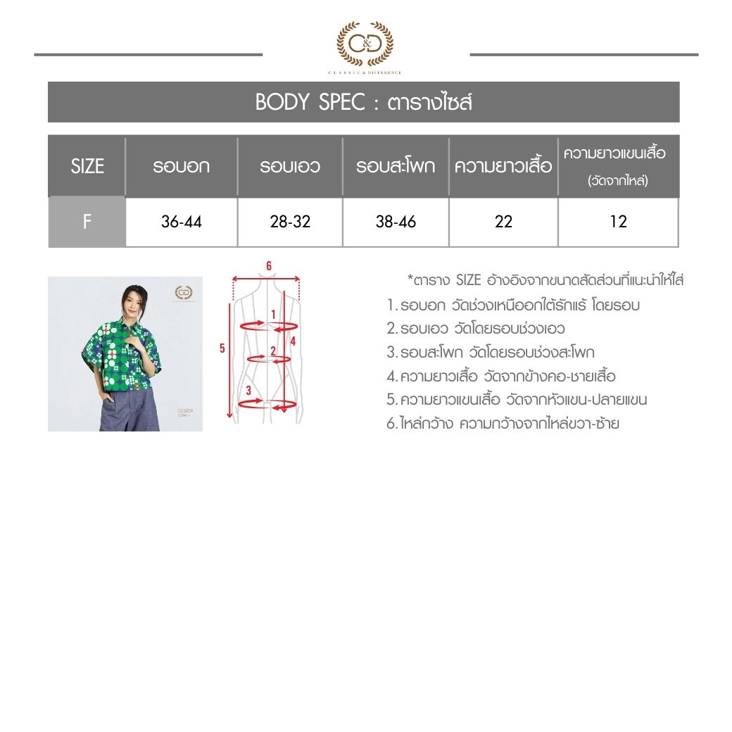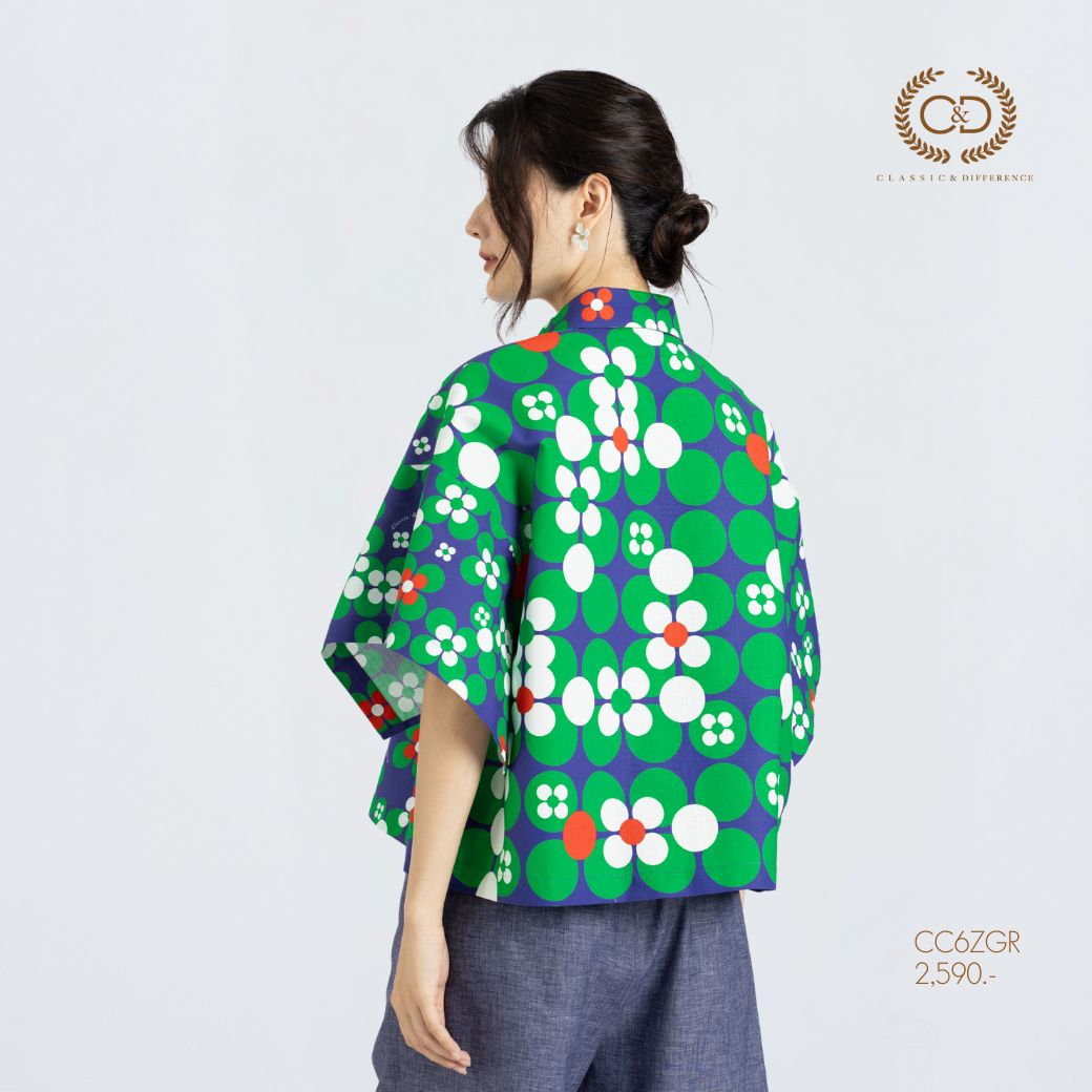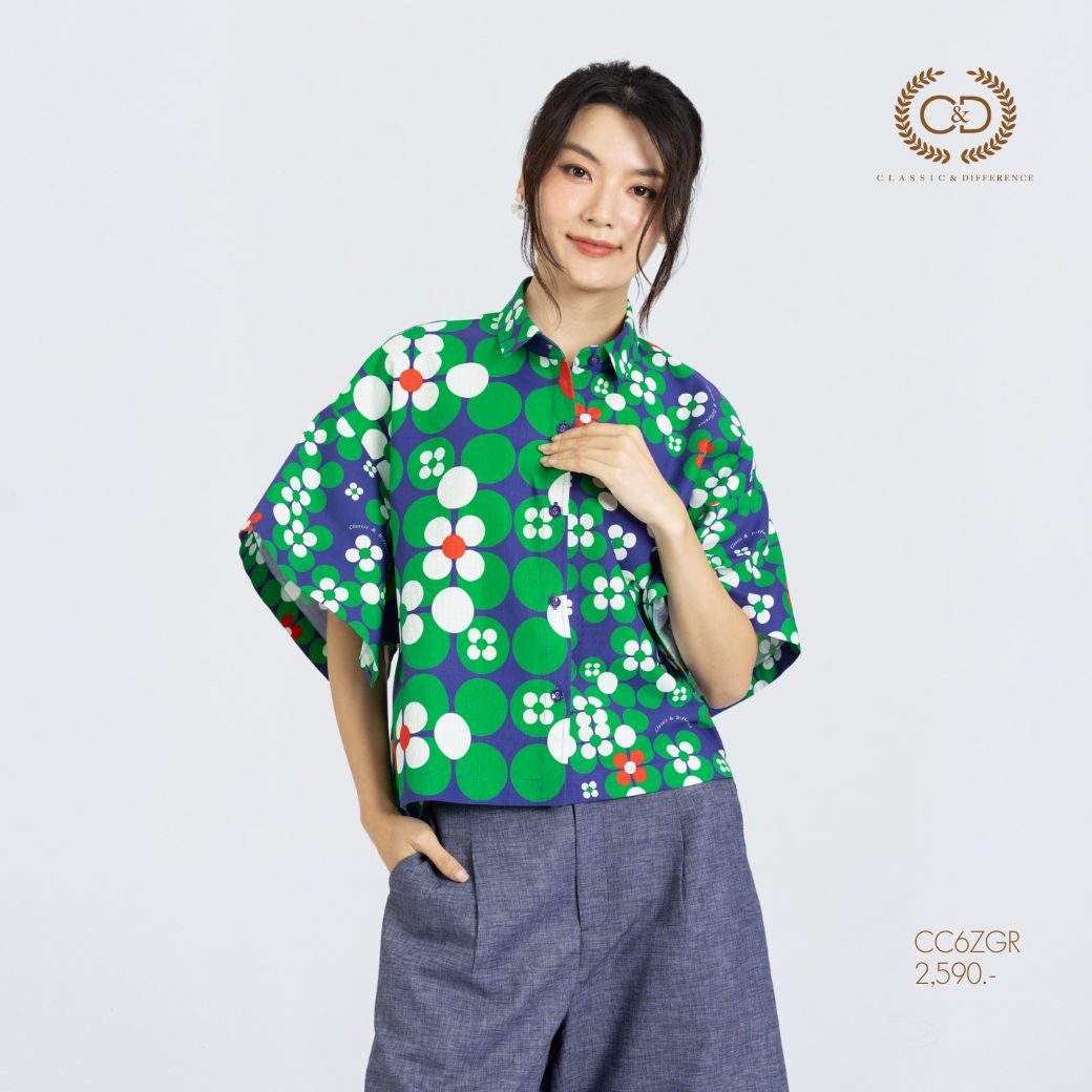 เสื้อผู้หญิง C&D Dot Flowers Green แขนสั้น ดีไซน์คอปกเชิ้ต แขนทรงกิโมโนขนาดใหญ่ทรงสี่เหลี่ยม ให้ลุคโดดเด่นแต่สุภาพ ผลิตจากผ้าคอตตอน 100% พิมพ์ลาย Dot Flowers สีเขียว สวมใส่สบาย เหมาะกับลุคประจำวัน ลุคท่องเที่ยว หรือสไตล์สปอร์ต สำหรับผู้หญิง Gen Y และ Gen