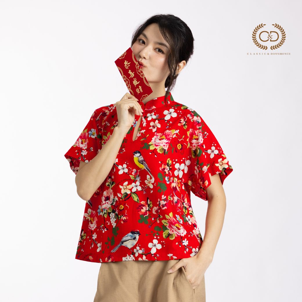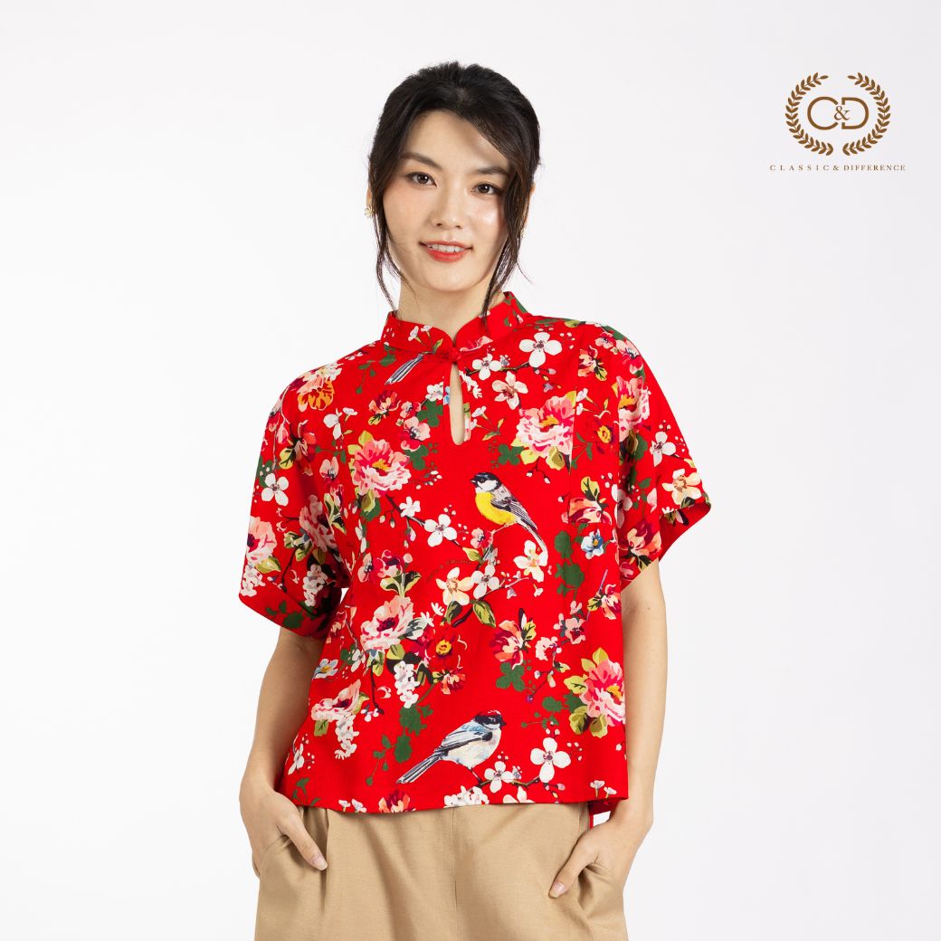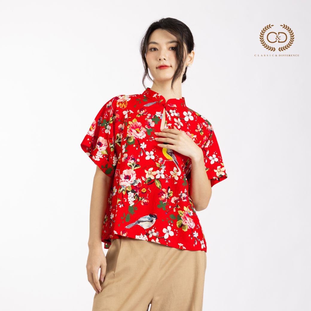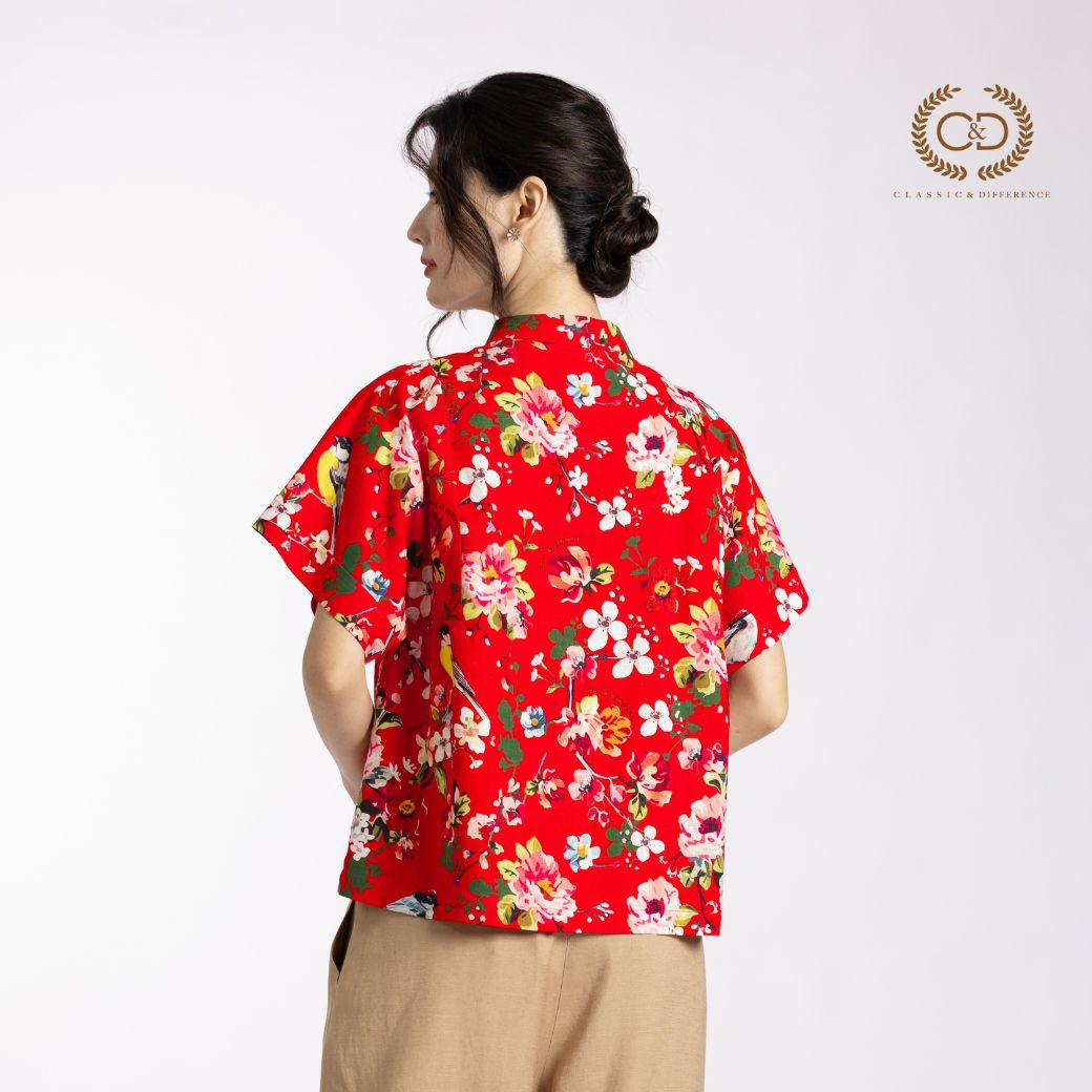 C&D woman’s blouse Tiny bird | เสื้อผู้หญิง คอตั้ง ติดกระดุมจีน สีแดง CBAYRE