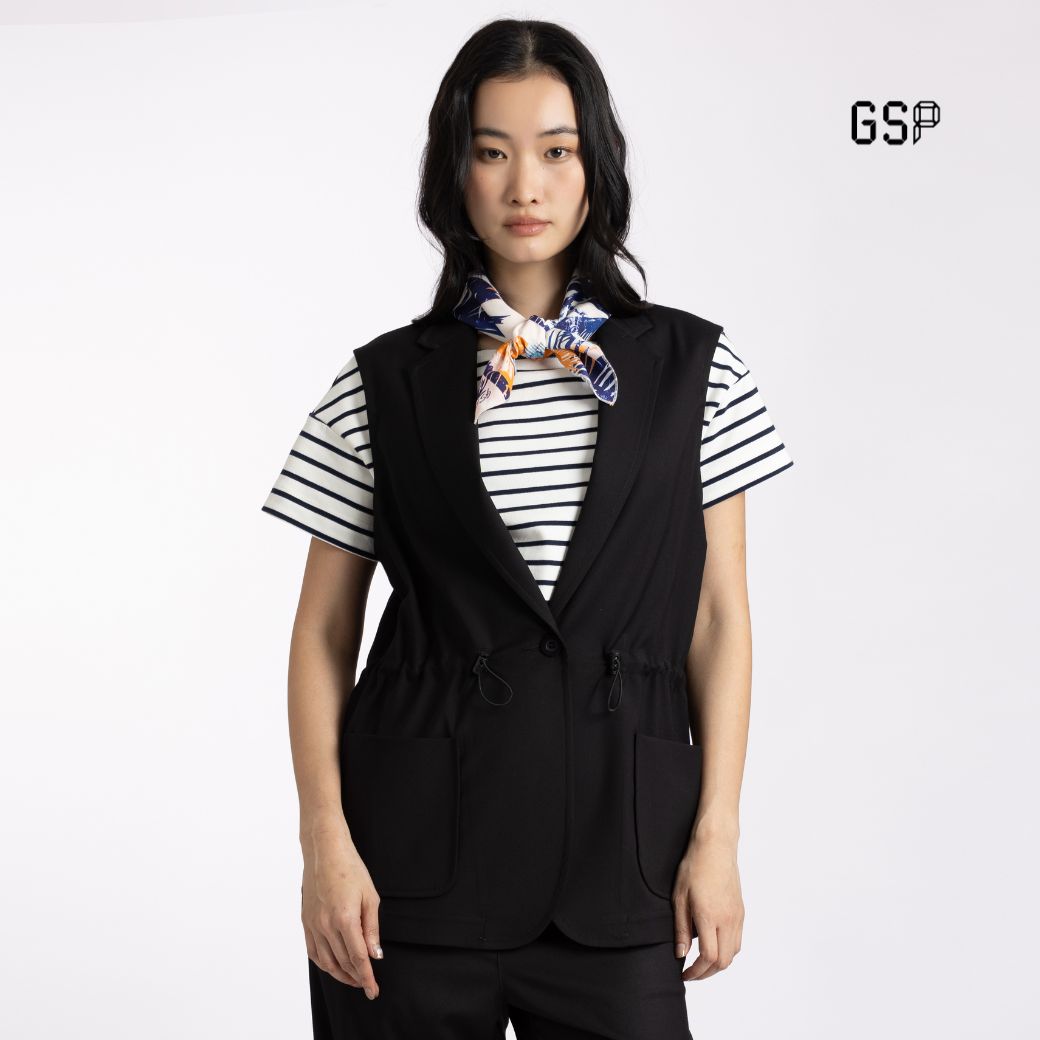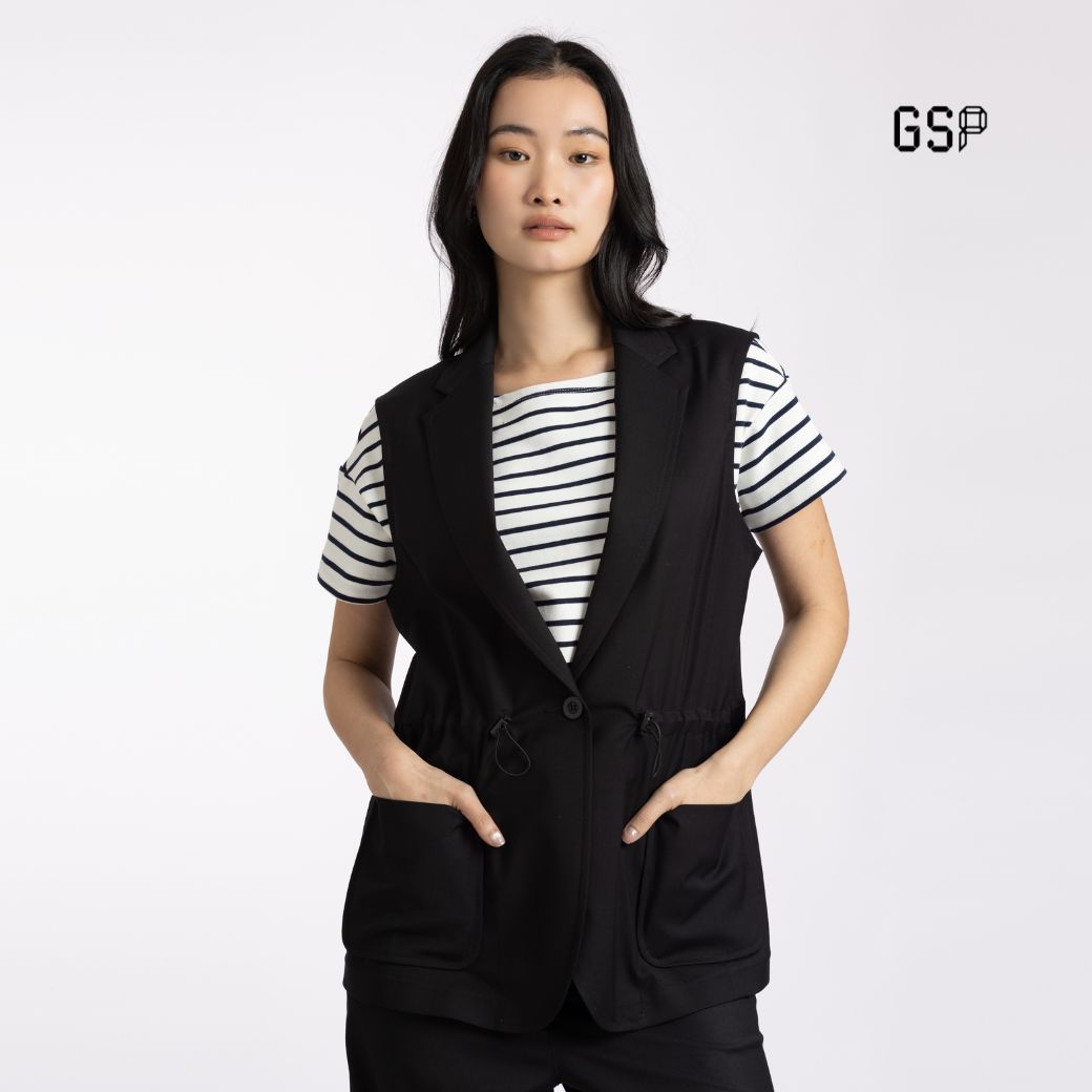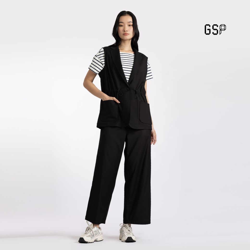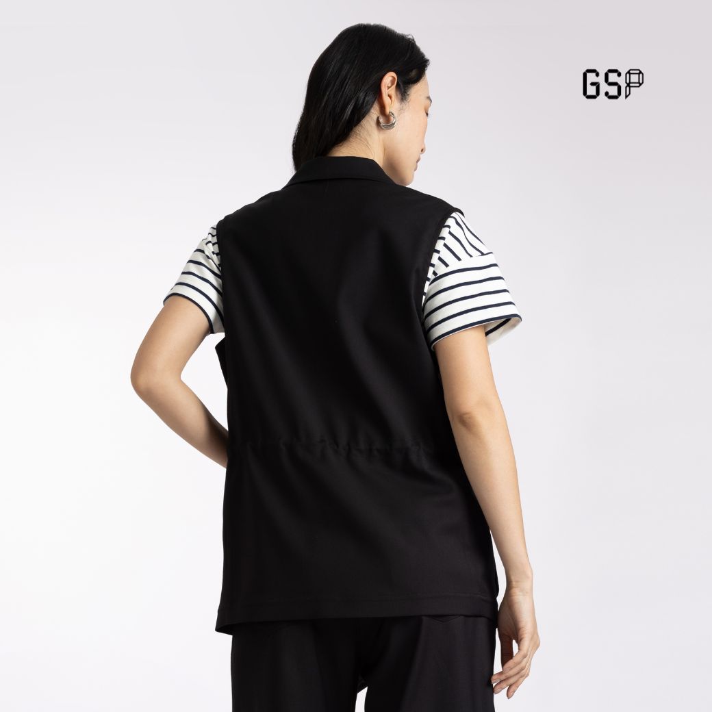 เสื้อคลุม 2 เวย์ สเตรท สีดำ ดีไซน์เรียบหรู แขนกุด ปกคอแบบเบลเซอร์ ผลิตจากผ้าโพลีเอสเตอร์คุณภาพดี ให้สัมผัสยืดหยุ่น สวมใส่สบาย มาพร้อมเชือกปรับเอวและตัวล็อกทั้งสองข้าง ช่วยปรับทรงให้กระชับ เหมาะสำหรับลุคทำงาน ลุควันสบาย หรือสไตล์ท่องเที่ยวที่ต้องการความคล่
