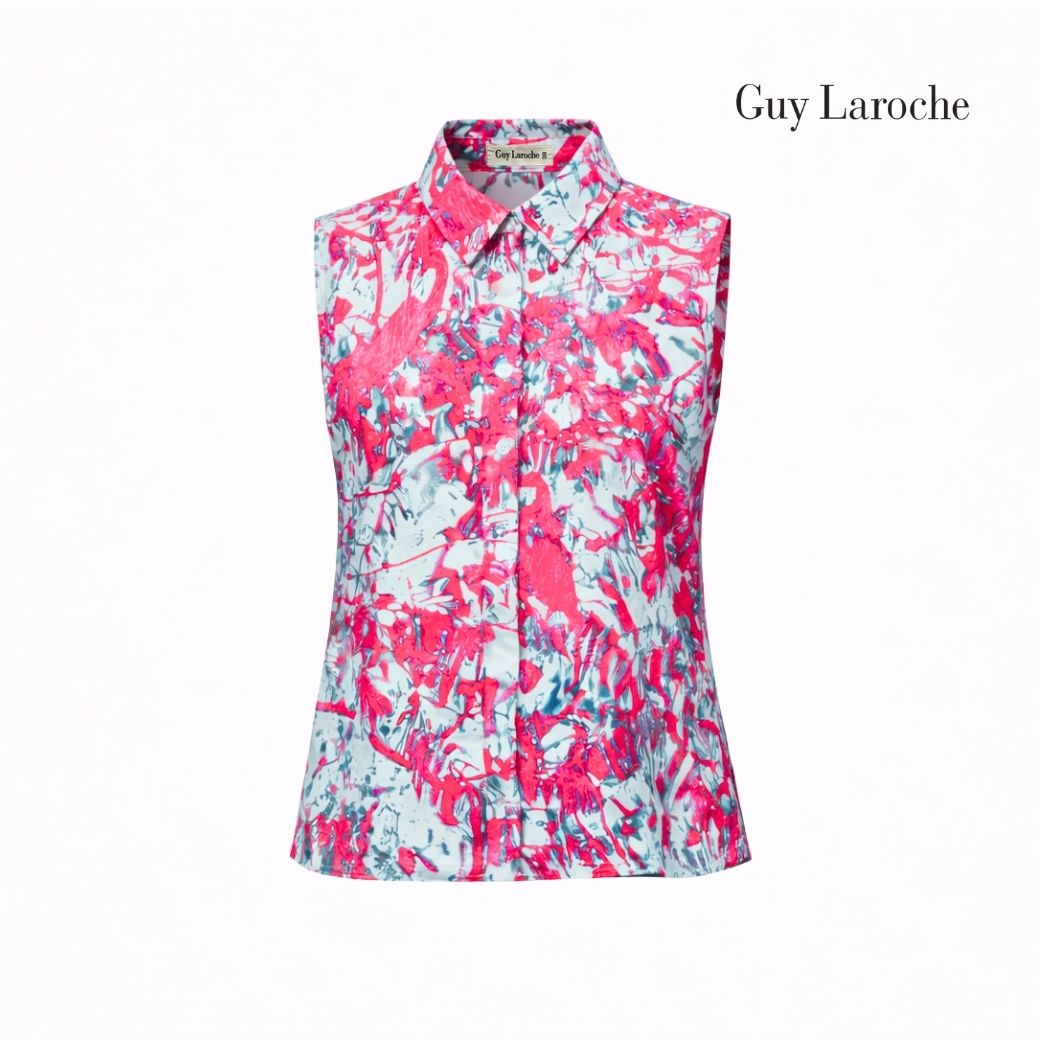 Guy Laroche Blouse เสื้อเบลาส์ผ้าจอร์เจียคอปก แขนกุด ลายพิมพ์ Pinky Flamingo GZ2NPI