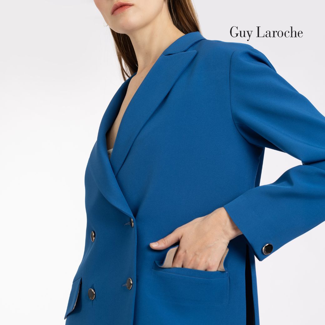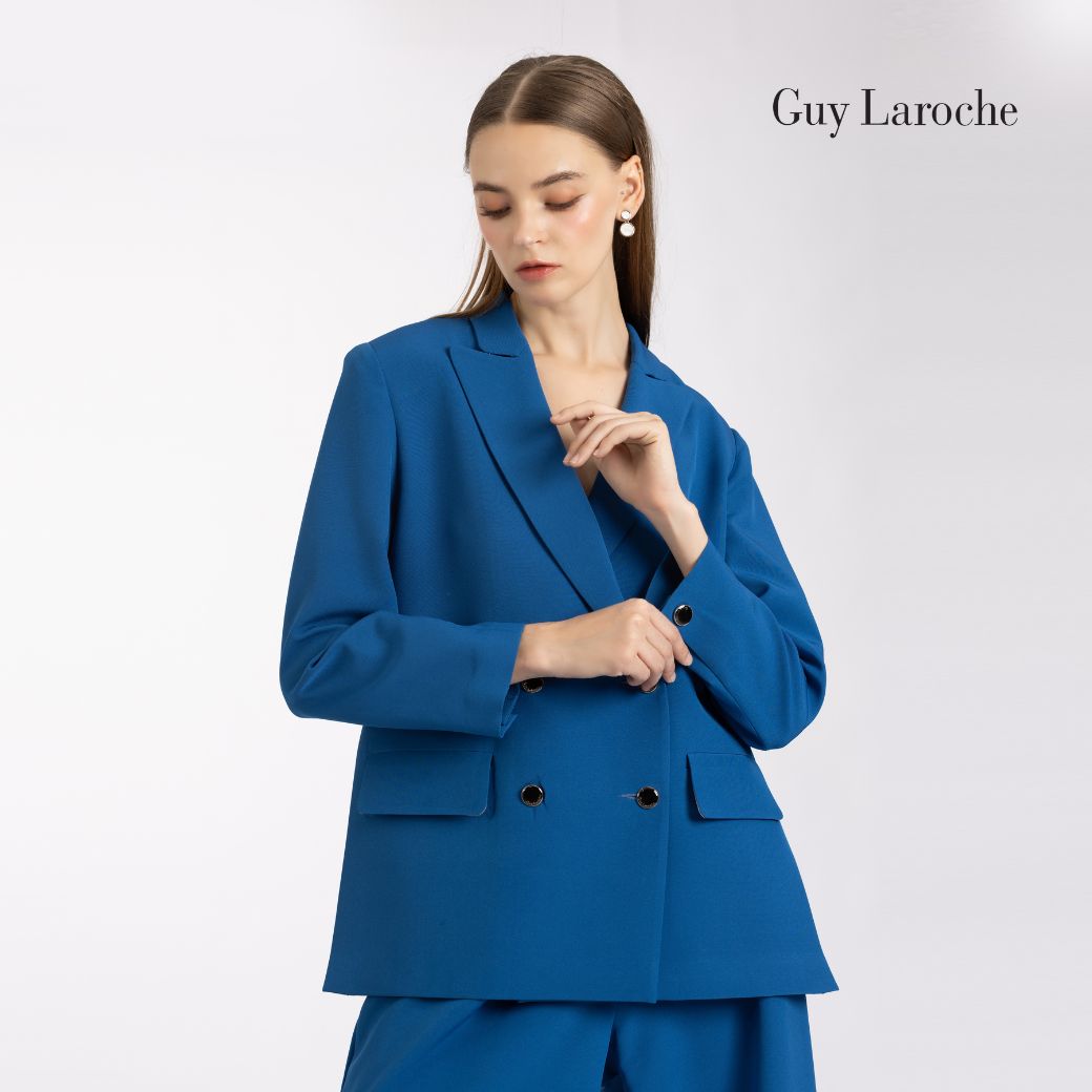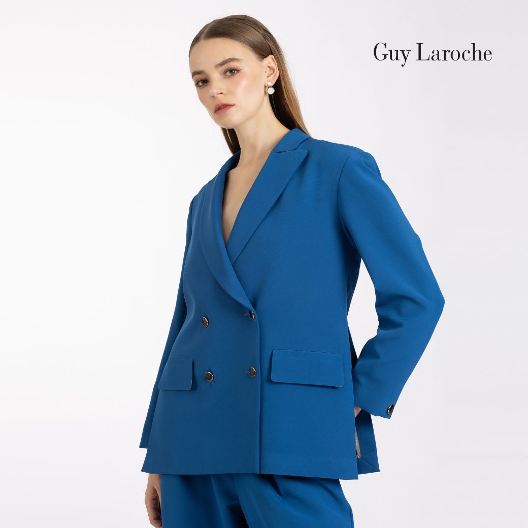 แจ็คเก็ตผู้หญิงแขนยาว สีน้ำเงินโคบอลต์ ผลิตจากผ้าคิงสูทติ้งโพลีเอสเตอร์ 100% ให้ผิวสัมผัสเรียบ คงรูปดี ดีไซน์ทรง Loose-fit แบบโอเวอร์ไซส์ คอปกคลาสสิก แขนยาว กระดุมโลโก้ GL 4 เม็ด พร้อมดีเทลผ่าชายด้านข้าง เพิ่มความคล่องตัวและสัดส่วนที่ดูโปร่ง เหมาะสำหรับวั