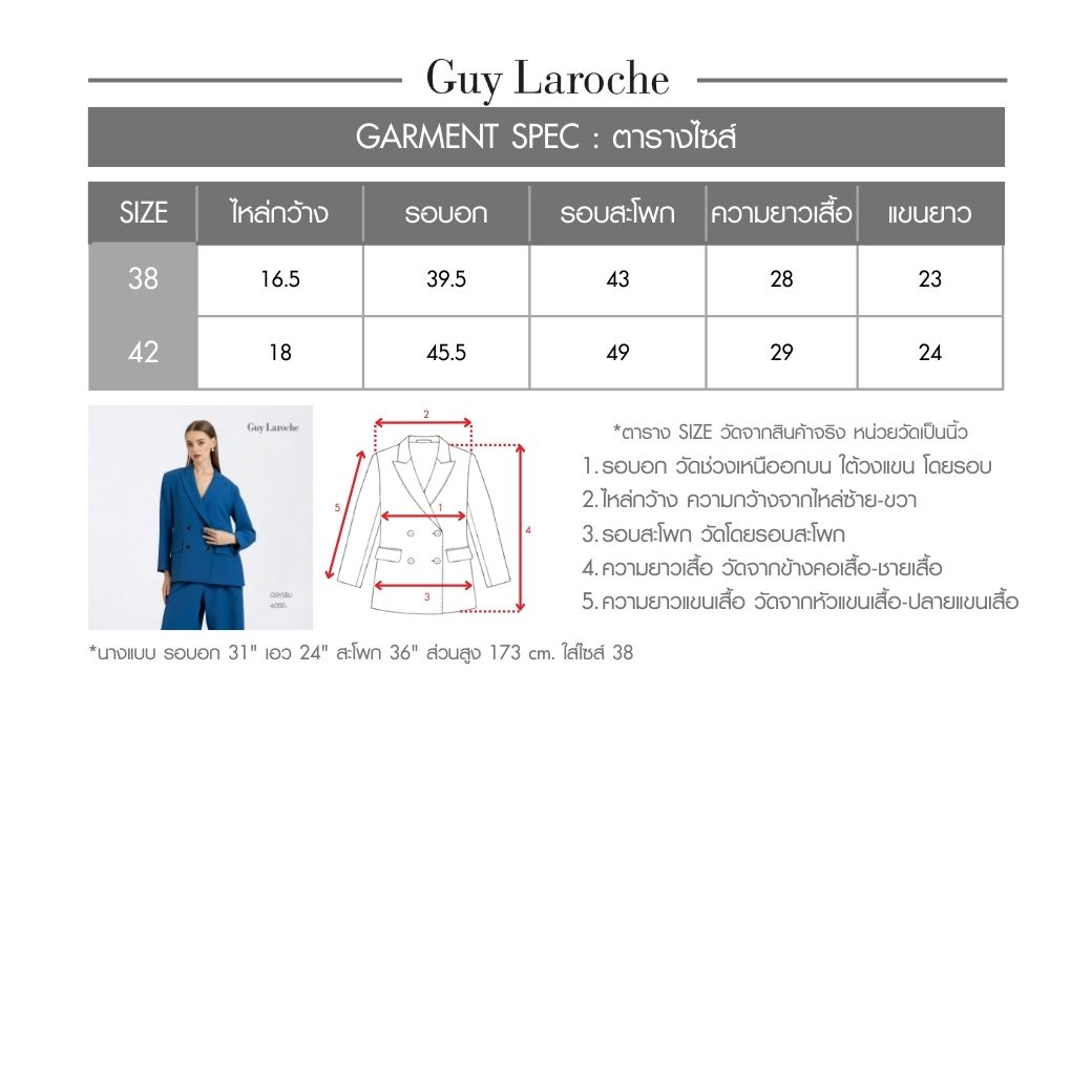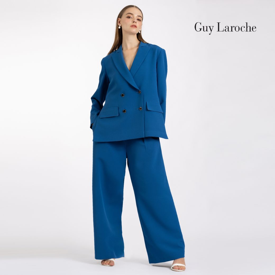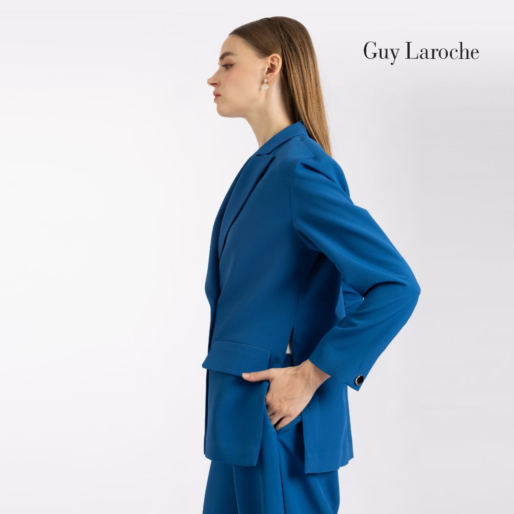 แจ็คเก็ตผู้หญิงแขนยาว สีน้ำเงินโคบอลต์ ผลิตจากผ้าคิงสูทติ้งโพลีเอสเตอร์ 100% ให้ผิวสัมผัสเรียบ คงรูปดี ดีไซน์ทรง Loose-fit แบบโอเวอร์ไซส์ คอปกคลาสสิก แขนยาว กระดุมโลโก้ GL 4 เม็ด พร้อมดีเทลผ่าชายด้านข้าง เพิ่มความคล่องตัวและสัดส่วนที่ดูโปร่ง เหมาะสำหรับวั