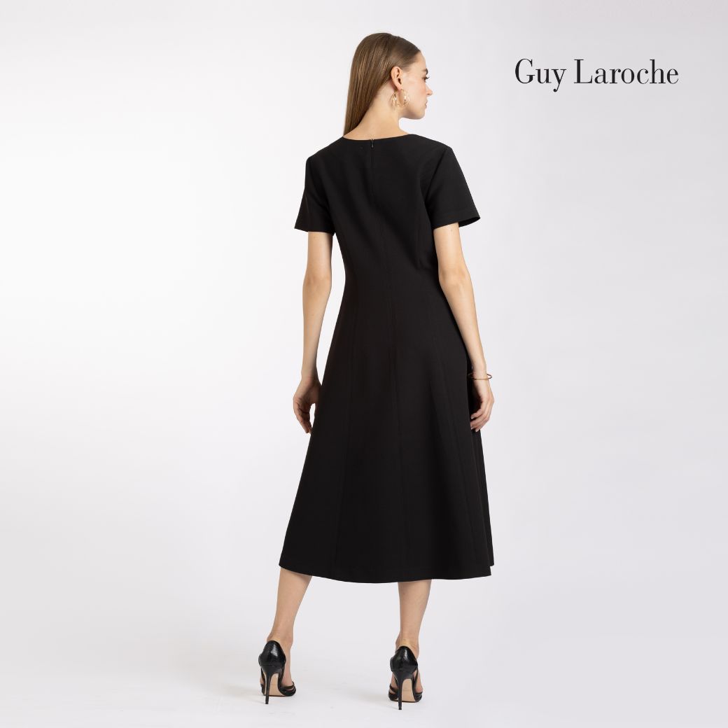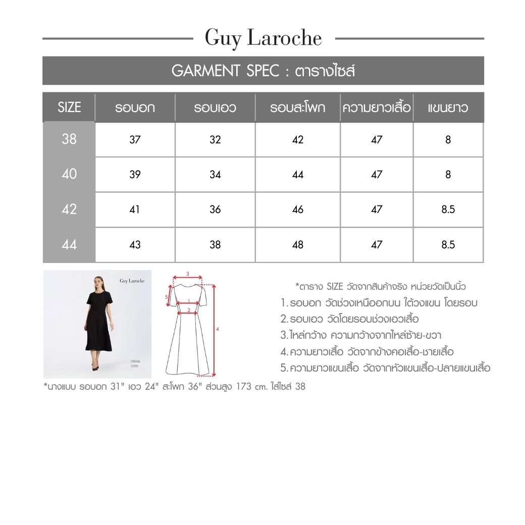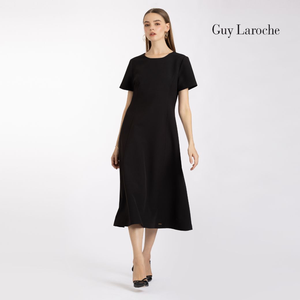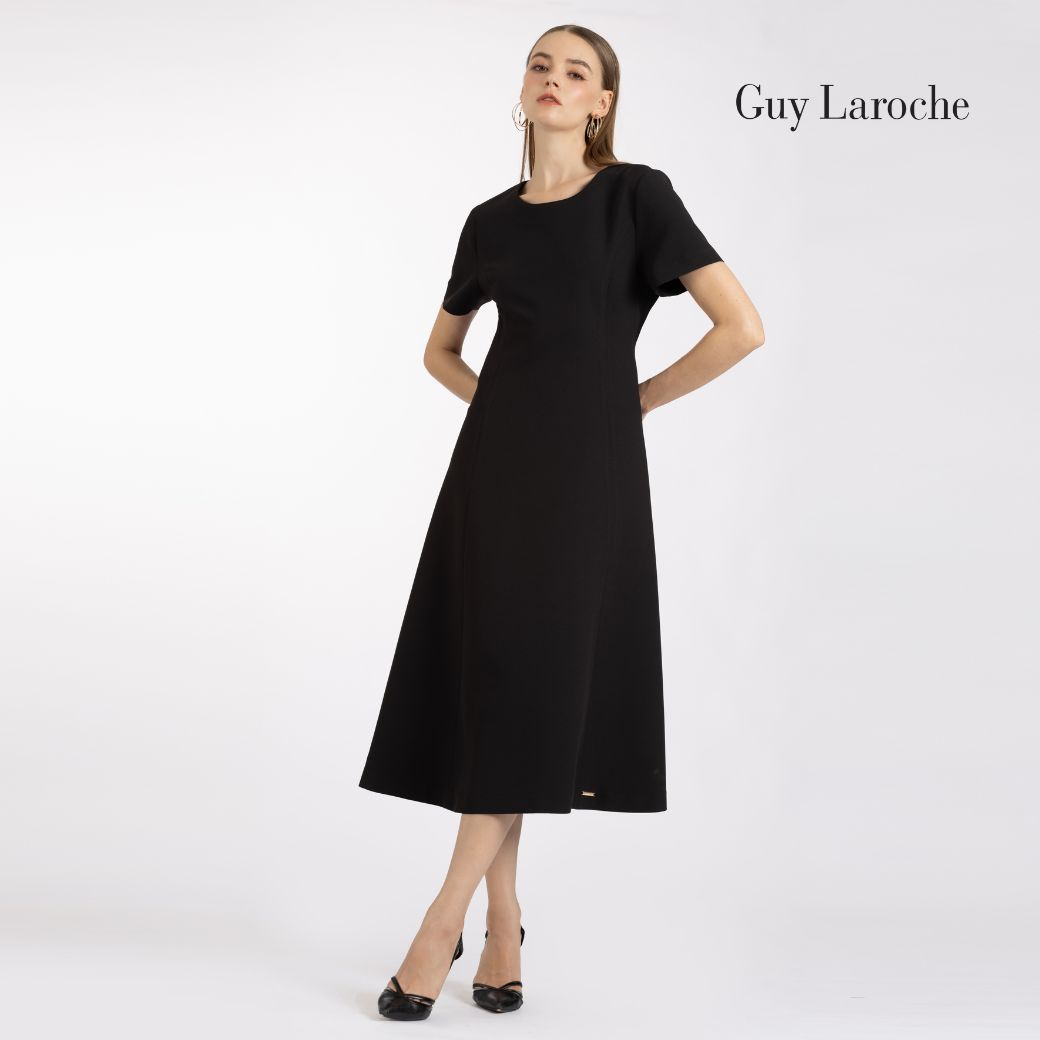เดรสยาว Guy Laroche ผลิตจากผ้าคิงสูทติ้งโพลีเอสเตอร์ 100% ทรง A-line กระโปรงบาน ความยาว 4 ส่วน แขนสั้น ดีไซน์เข้ารูปช่วยเสริมสัดส่วน สวมใส่สุภาพ เรียบหรู เหมาะสำหรับลุคทำงานแบบ Business Look หรือสวมใส่ในชีวิตประจำวันอย่างมีระดับ