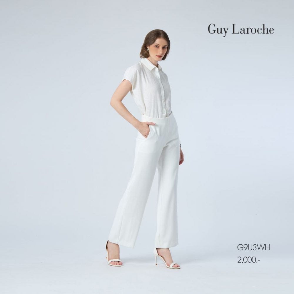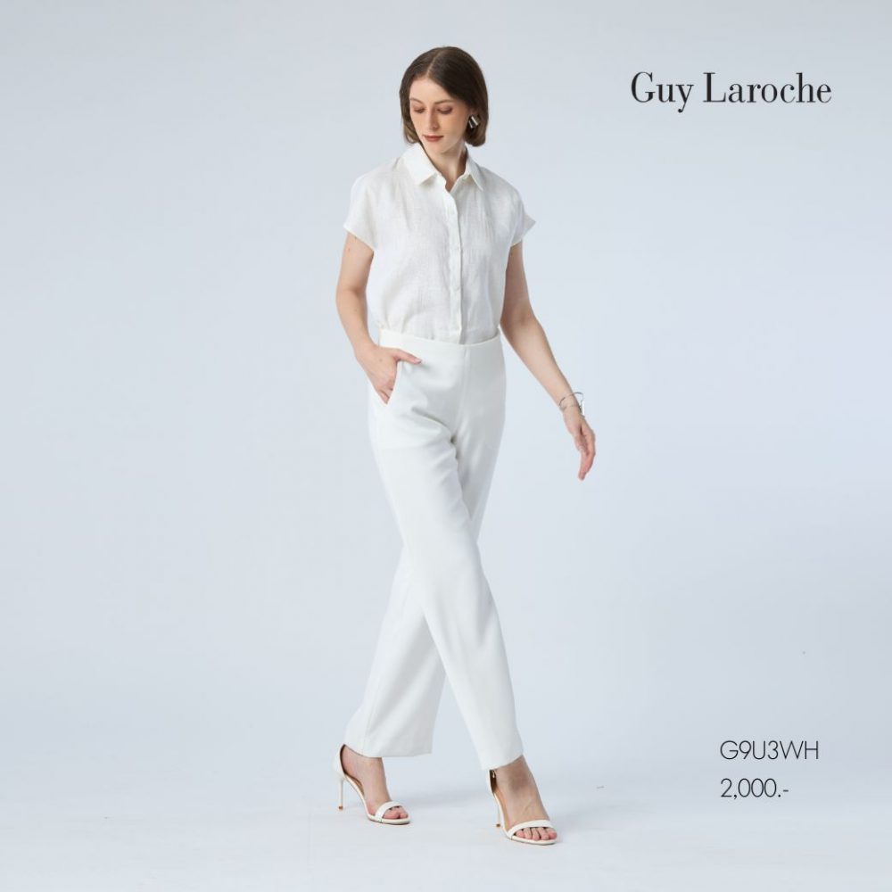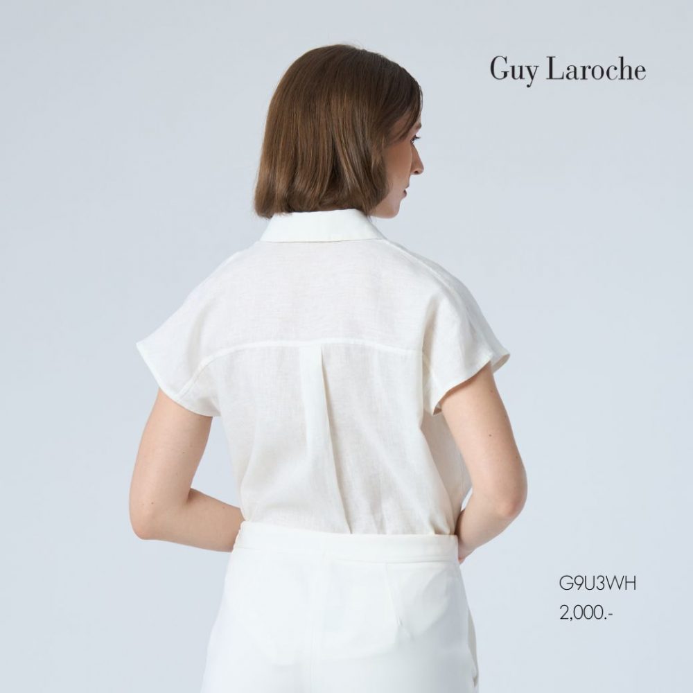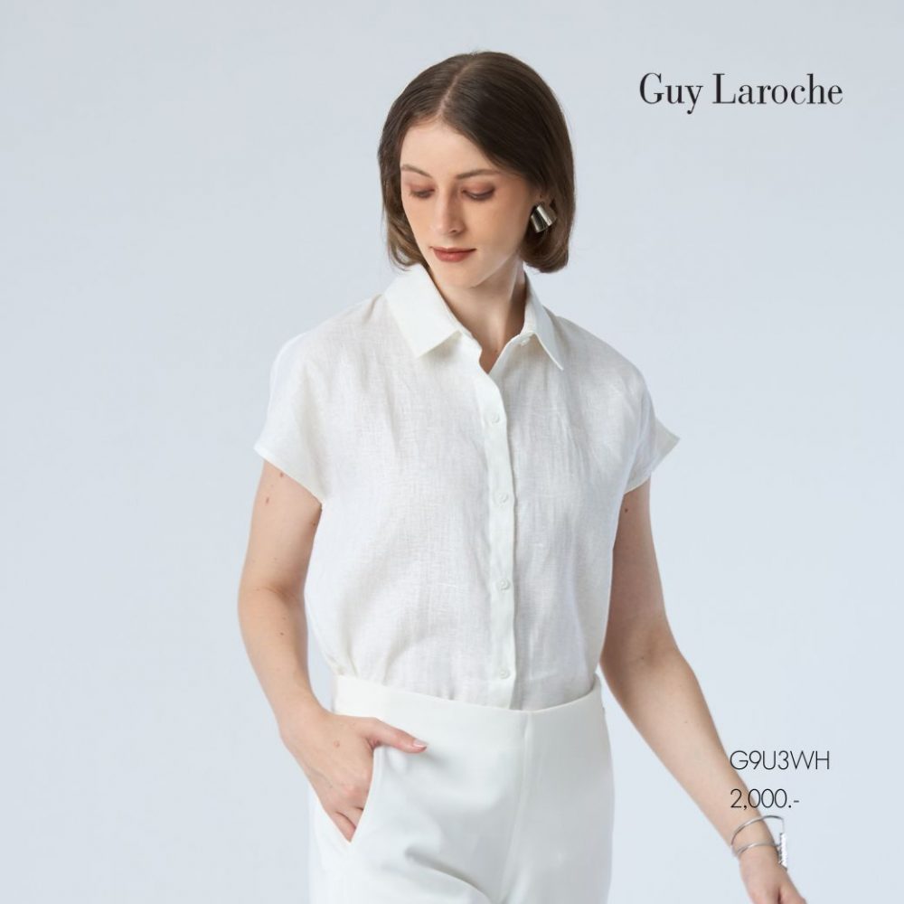เสื้อเชิ้ตผู้หญิง แขนสั้น เนื้ื้อผ้าลินิน Light Linen ชนิดพิเศษทอเนียนเรียบ ระบายอากาศดี เย็นสบาย สีขาว ใส่แล้วช่วยให้ผิวหน้าสว่างใส แมทช์กับกางเกงและกระโปรงได้สวยง่าย ไอเทมขายดี แบรนด์ Guy Laroche