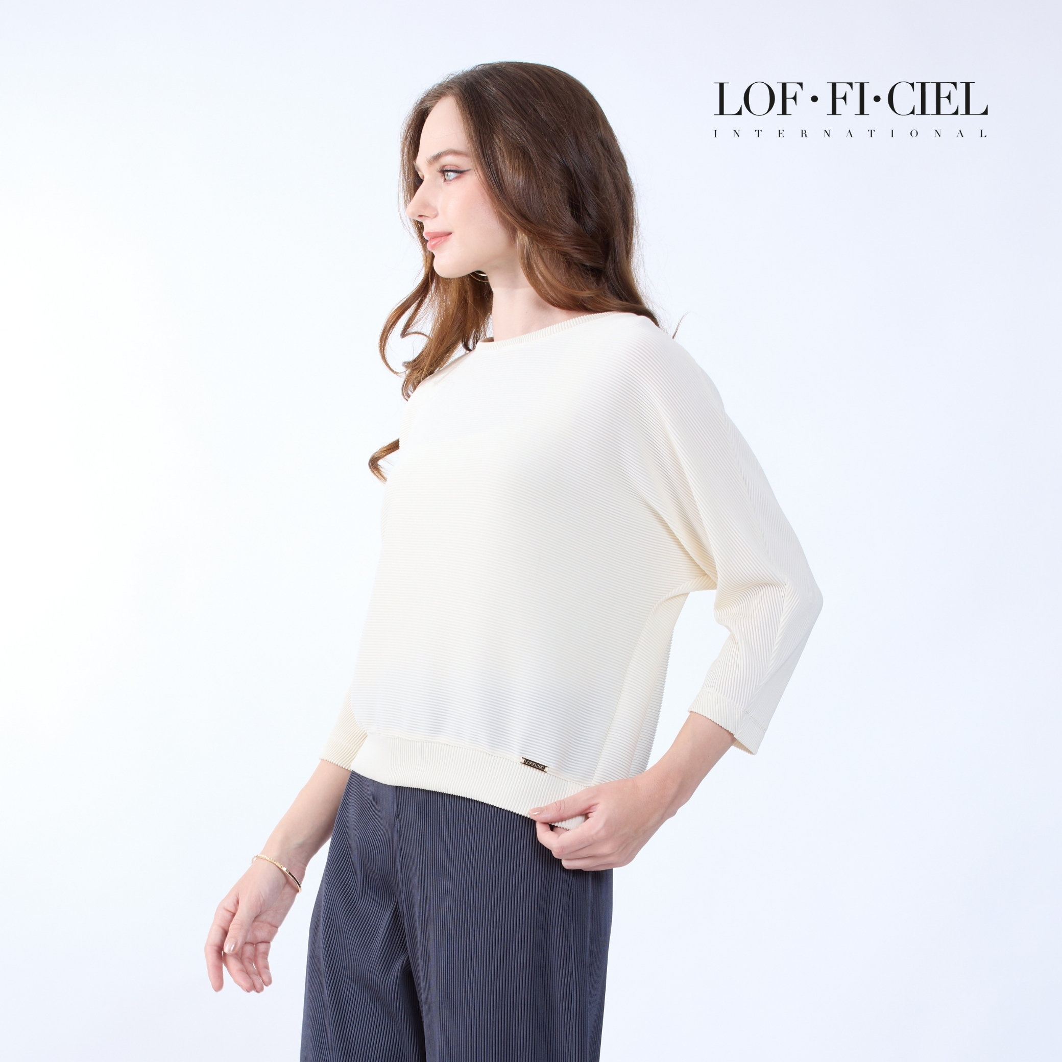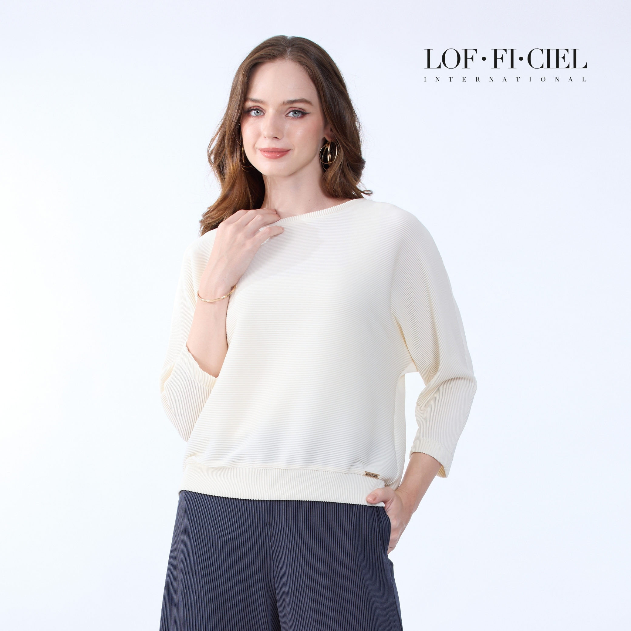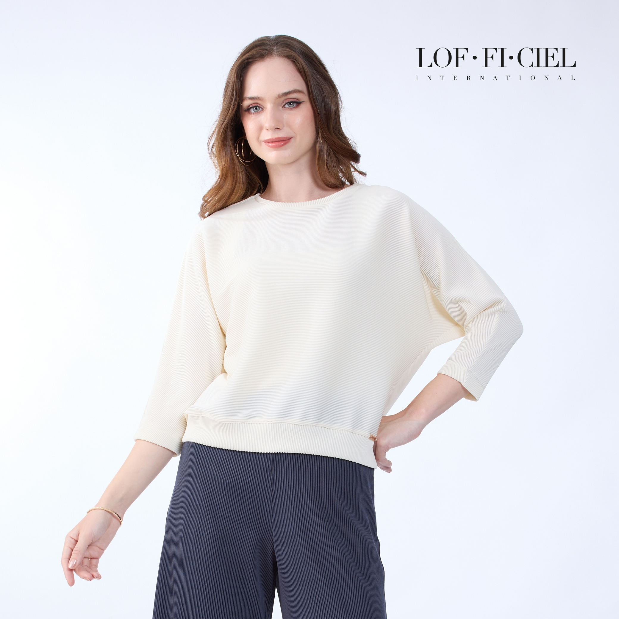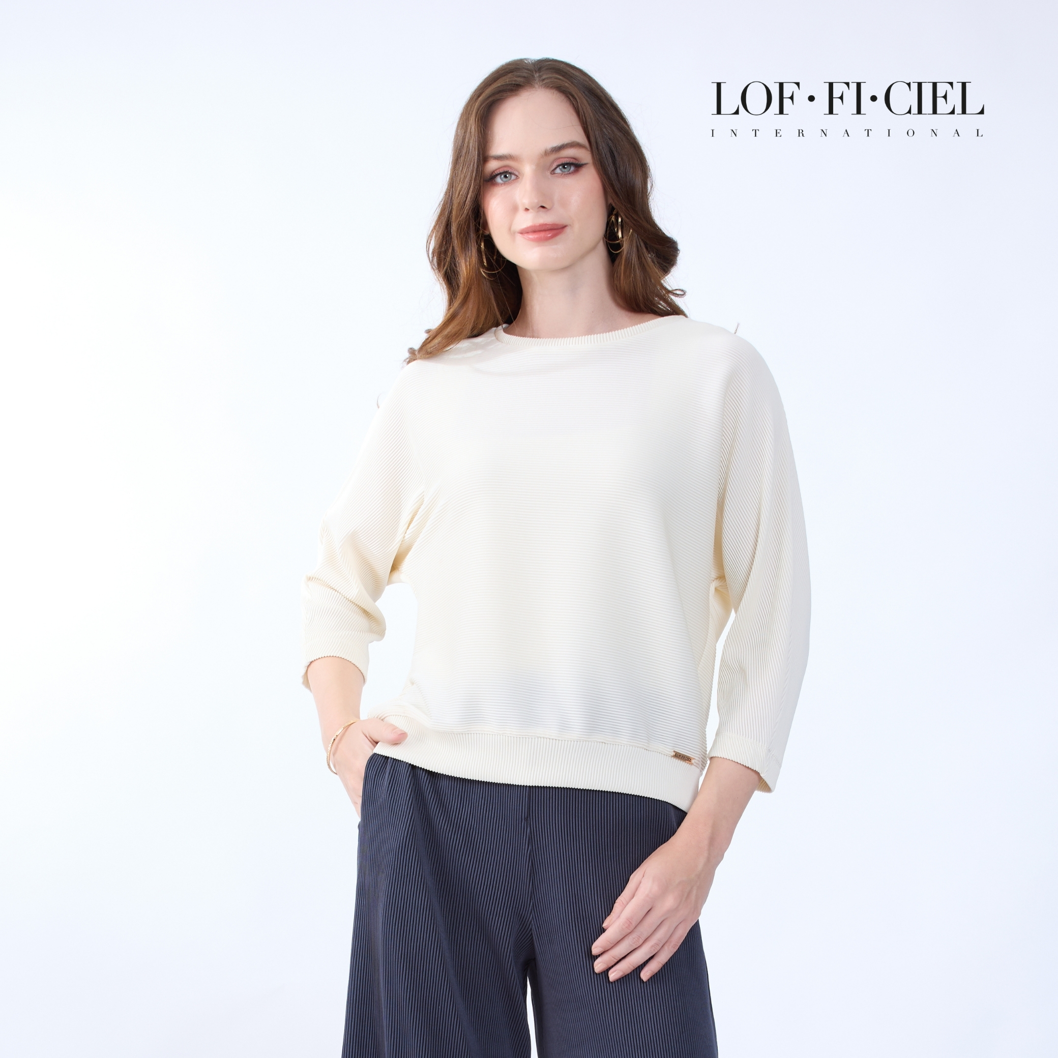 เสื้อผู้หญิง LOF-FI-CIE สีขาว ผลิตจากผ้าโพลีเอสเตอร์ผสมสแปนเด็กซ์ เนื้อผ้ายืดหยุ่น น้ำหนักเบา ดีไซน์คอกลม แขนสามส่วน วงแขนในตัวช่วยให้เคลื่อนไหวสะดวก ผิวผ้า Simple Cord เรียบเนียน ดูสุภาพและทันสมัย เหมาะสำหรับวันทำงาน การประชุม และโอกาสที่ต้องการลุคเป็นทางการอย่างมั่นใจ