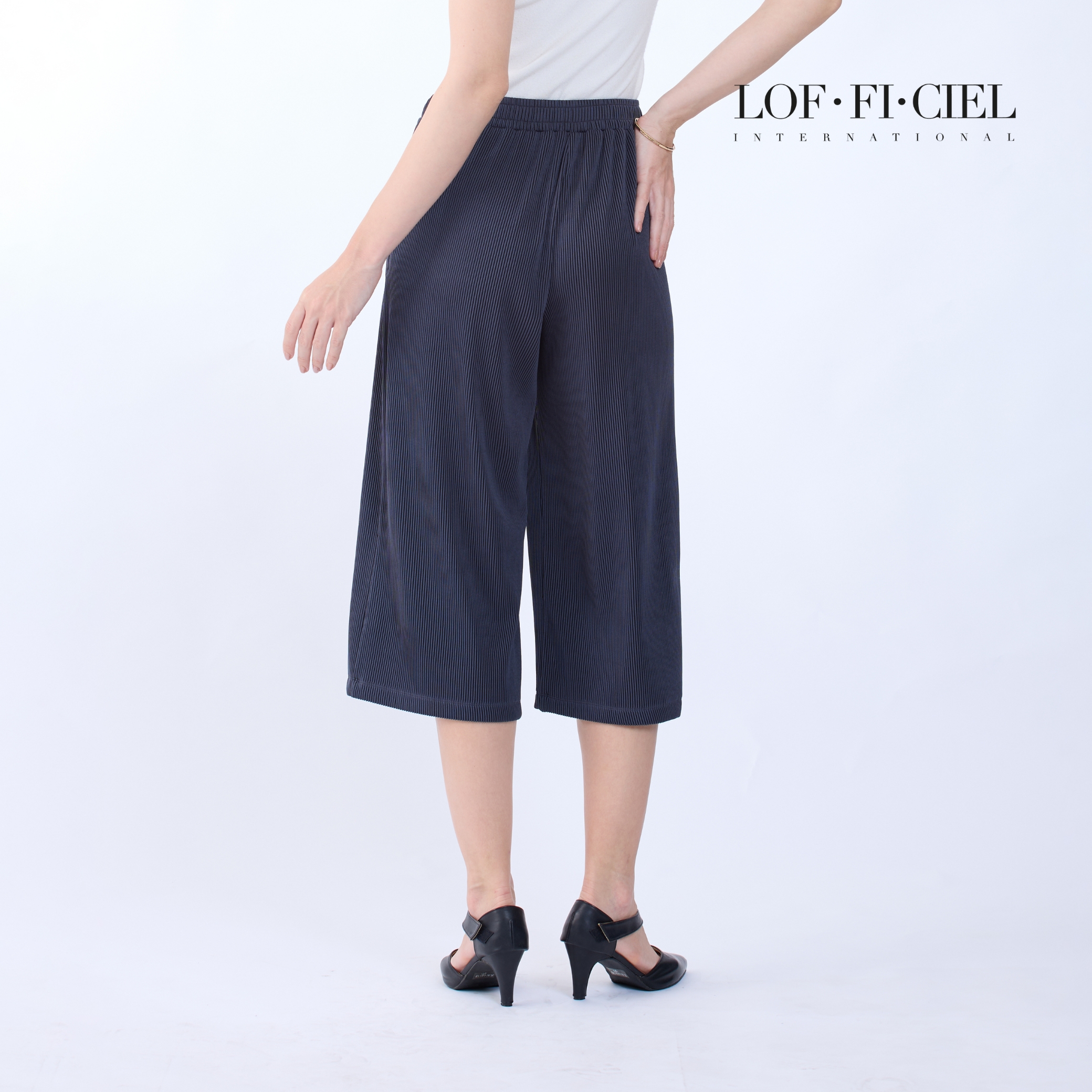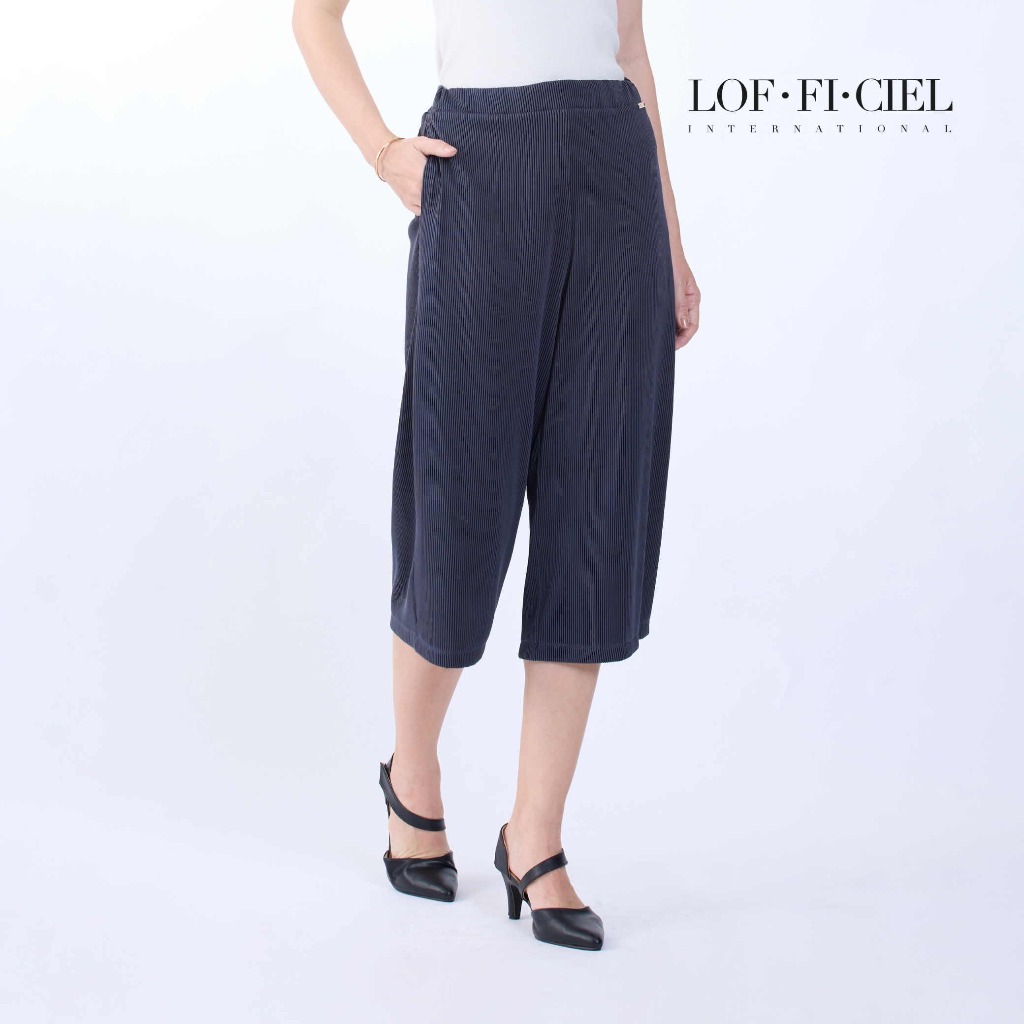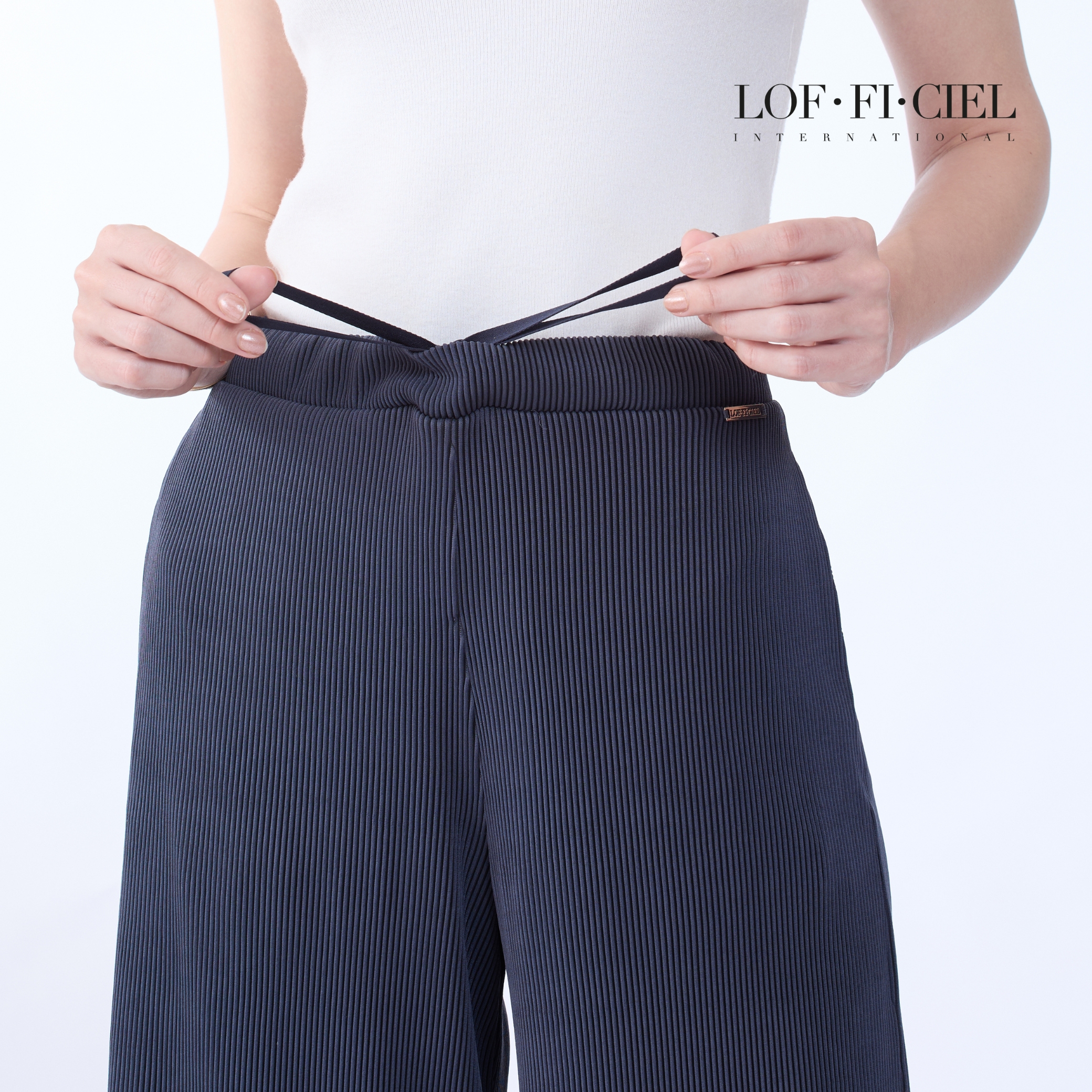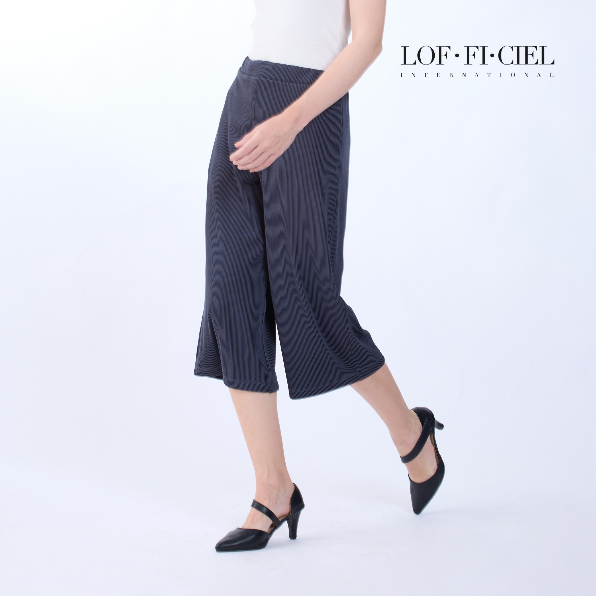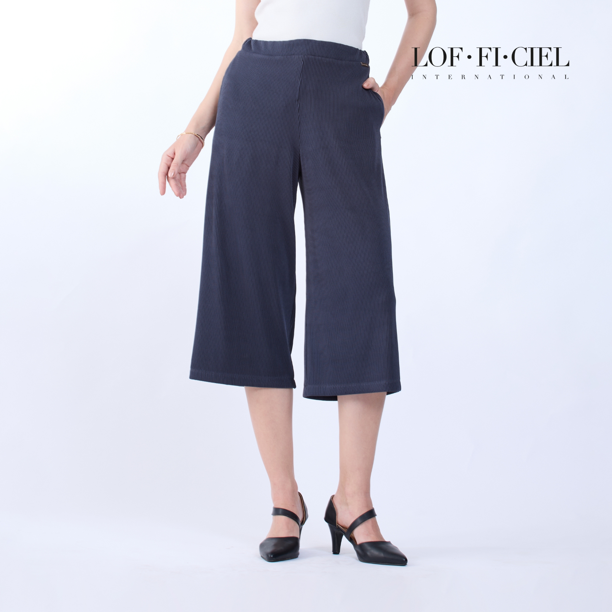 กางเกงผู้หญิง LOF-FI-CIE สีเทา ผลิตจากผ้าโพลีเอสเตอร์ผสมสแปนเด็กซ์ เนื้อผ้ายืดหยุ่น น้ำหนักเบา ทรงขากว้างช่วยเสริมความคล่องตัว ขอบเอวหน้าเรียบให้ลุคสุภาพ ด้านหลังยางยืดสวมใส่กระชับสบาย ผ้า Simple Cord มอบผิวสัมผัสเรียบเนียน เหมาะสำหรับวันทำงาน การประชุม และโอกาสทางการที่ต้องการความมั่นใจ