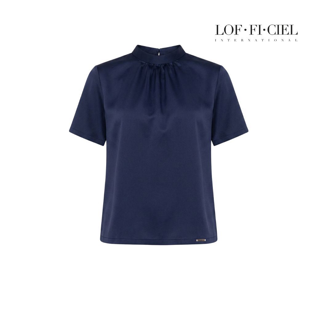 เสื้อผู้หญิง LOF-FI-CIE สีกรมผลิตจากผ้าซิลค์ซาติน ดีไซน์เบลาส์คอตั้งแขนสั้น ให้สัมผัสเรียบลื่น เงางาม รูดช่วงคอช่วยพลางช่วงหน้าอกและเพิ่มมิติให้ทรงเสื้อ ดูสุภาพและโดดเด่นในเวลาเดียวกัน เนื้อผ้าทิ้งตัวดี สวมใส่สบาย เหมาะสำหรับวันทำงาน ลุคธุรกิจ หรือโอกาสพิ
