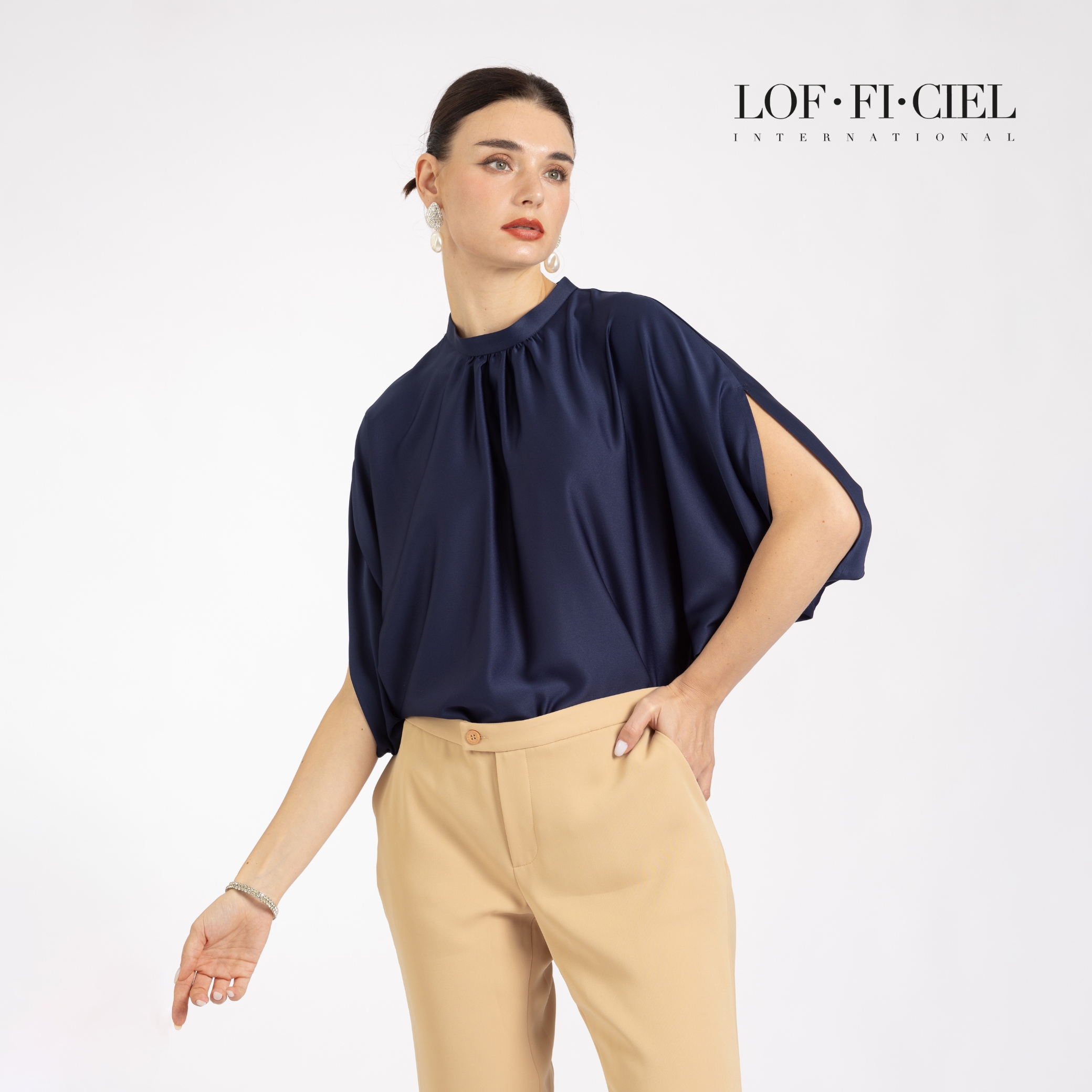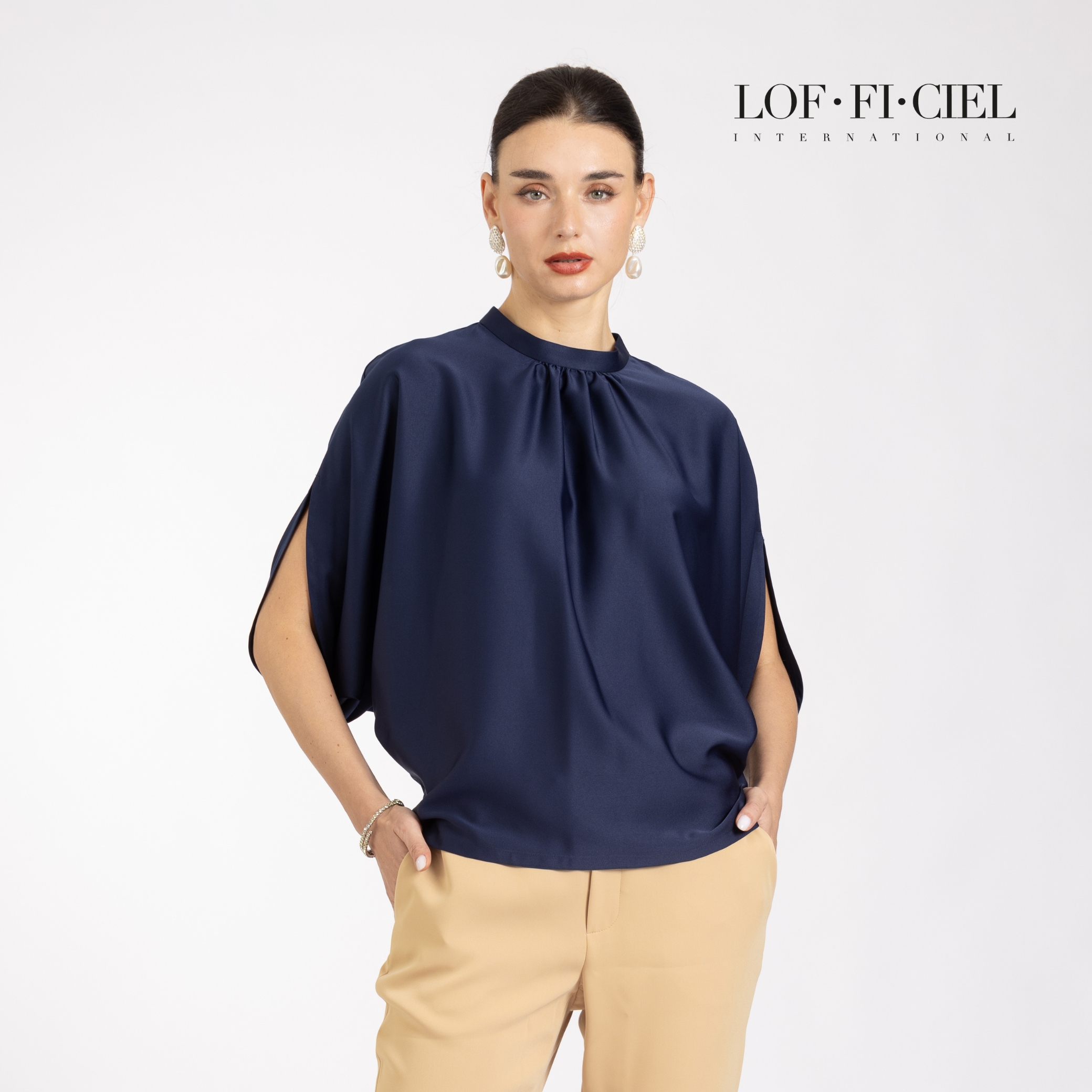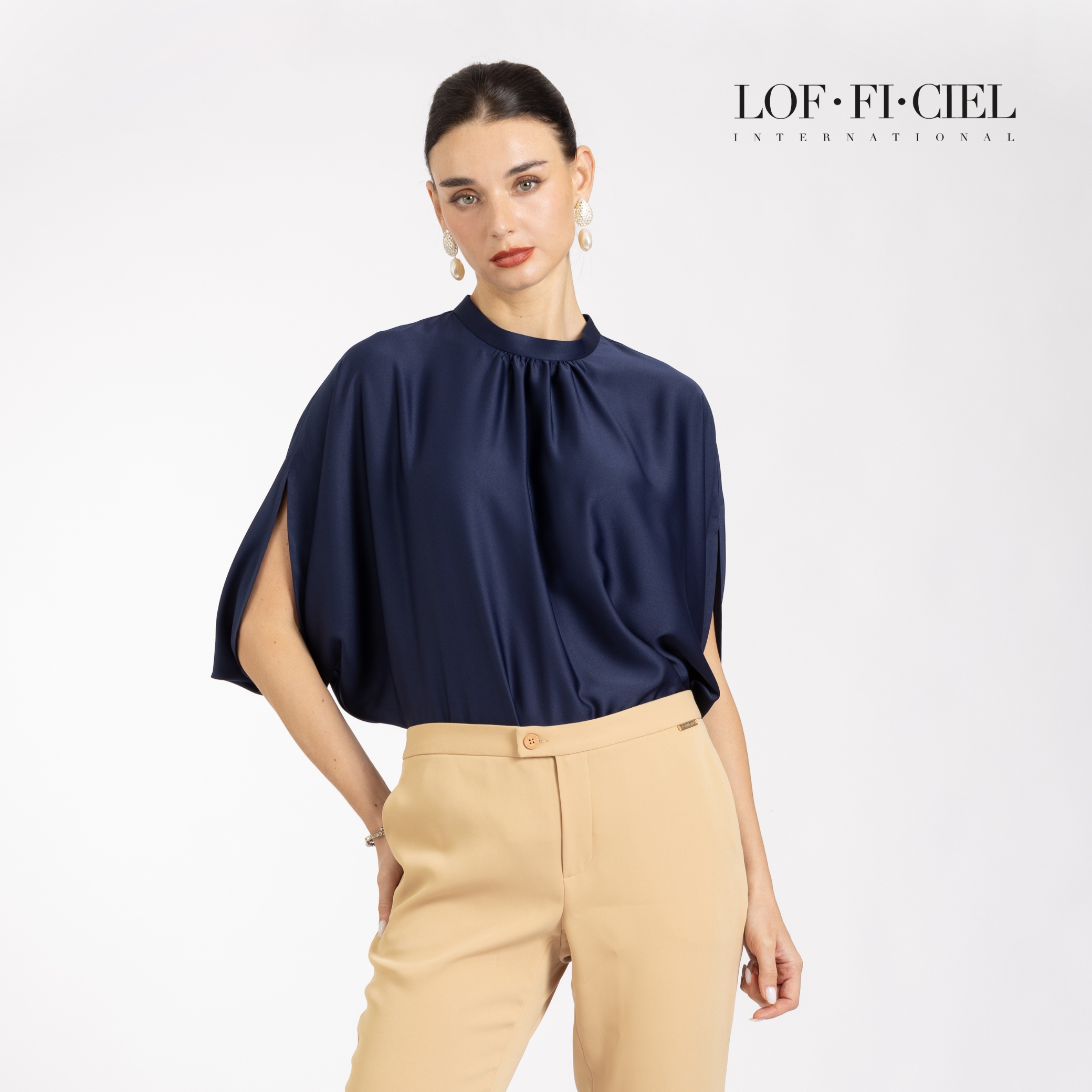 เสื้อผู้หญิง LOF-FI-CIE สีกรม ผลิตจากผ้าซิลค์ซาตินเนื้อเนียน ให้สัมผัสลื่นและเงางาม ดีไซน์เบลาส์คอตั้ง ทรงหลวม แขนสี่ส่วนแบบไม่ตัดต่อแขน เพิ่มดีเทลรูดช่วงคอช่วยพลางสรีระช่วงอก สวมใส่สบาย เคลื่อนไหวคล่องตัว เหมาะสำหรับวันทำงาน ลุคธุรกิจ หรือโอกาสพิเศษที่ต้องการความสุภาพอย่างมีรสนิยม