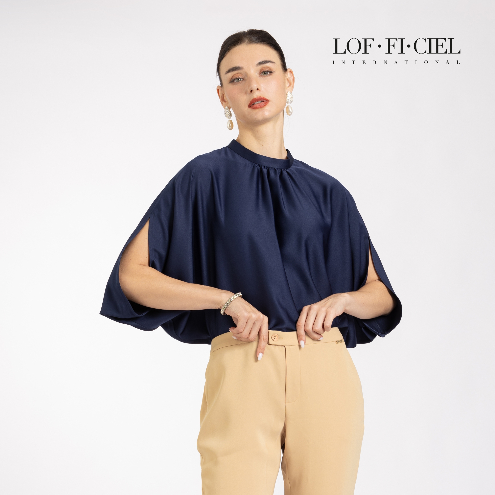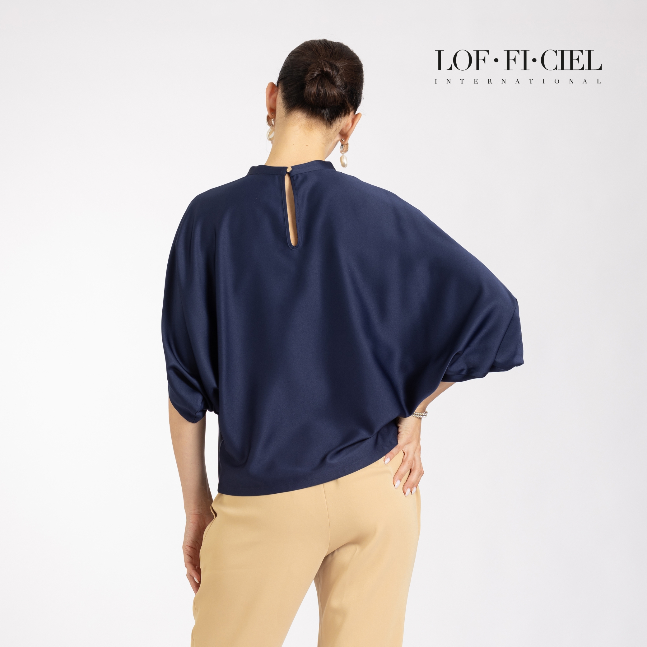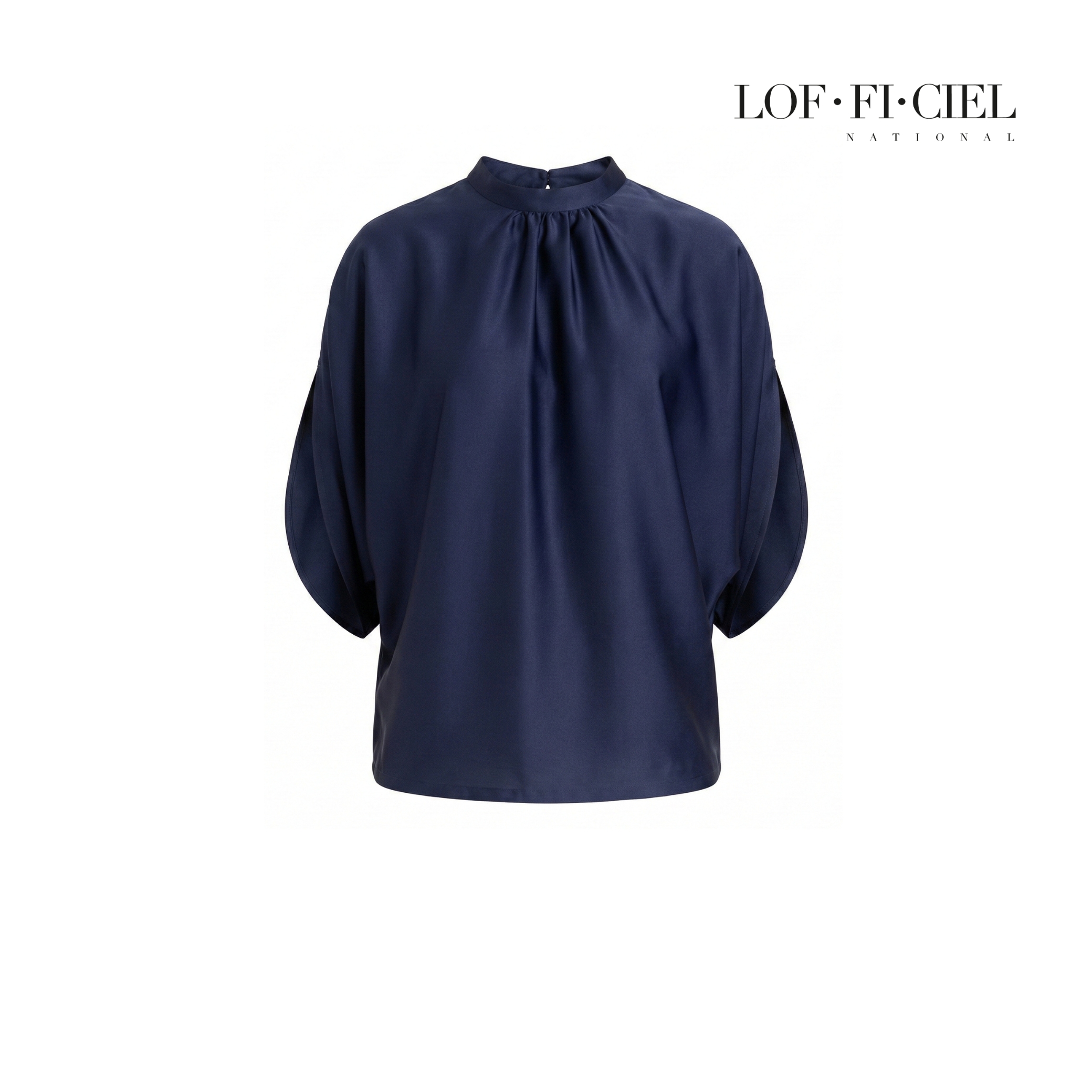 เสื้อผู้หญิง LOF-FI-CIE สีกรม ผลิตจากผ้าซิลค์ซาตินเนื้อเนียน ให้สัมผัสลื่นและเงางาม ดีไซน์เบลาส์คอตั้ง ทรงหลวม แขนสี่ส่วนแบบไม่ตัดต่อแขน เพิ่มดีเทลรูดช่วงคอช่วยพลางสรีระช่วงอก สวมใส่สบาย เคลื่อนไหวคล่องตัว เหมาะสำหรับวันทำงาน ลุคธุรกิจ หรือโอกาสพิเศษที่ต้องการความสุภาพอย่างมีรสนิยม