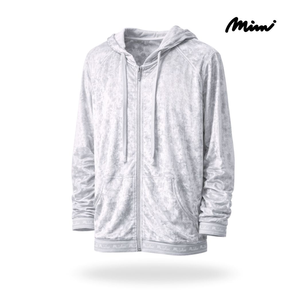 เสื้อแจ็กเก็ตผ้ากำมะหยี่มีฮู้ด ปักหน้า MIMI ที่อกด้านซ้ายแต่งขอบแขนและจั้มชายเสื้อด้วยเทปพิมพ์ MIMI