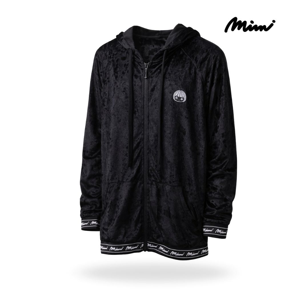 เสื้อแจ็กเก็ตผ้ากำมะหยี่มีฮู้ด ปักหน้า MIMI ที่อกด้านซ้ายแต่งขอบแขนและจั้มชายเสื้อด้วยเทปพิมพ์ MIMI
