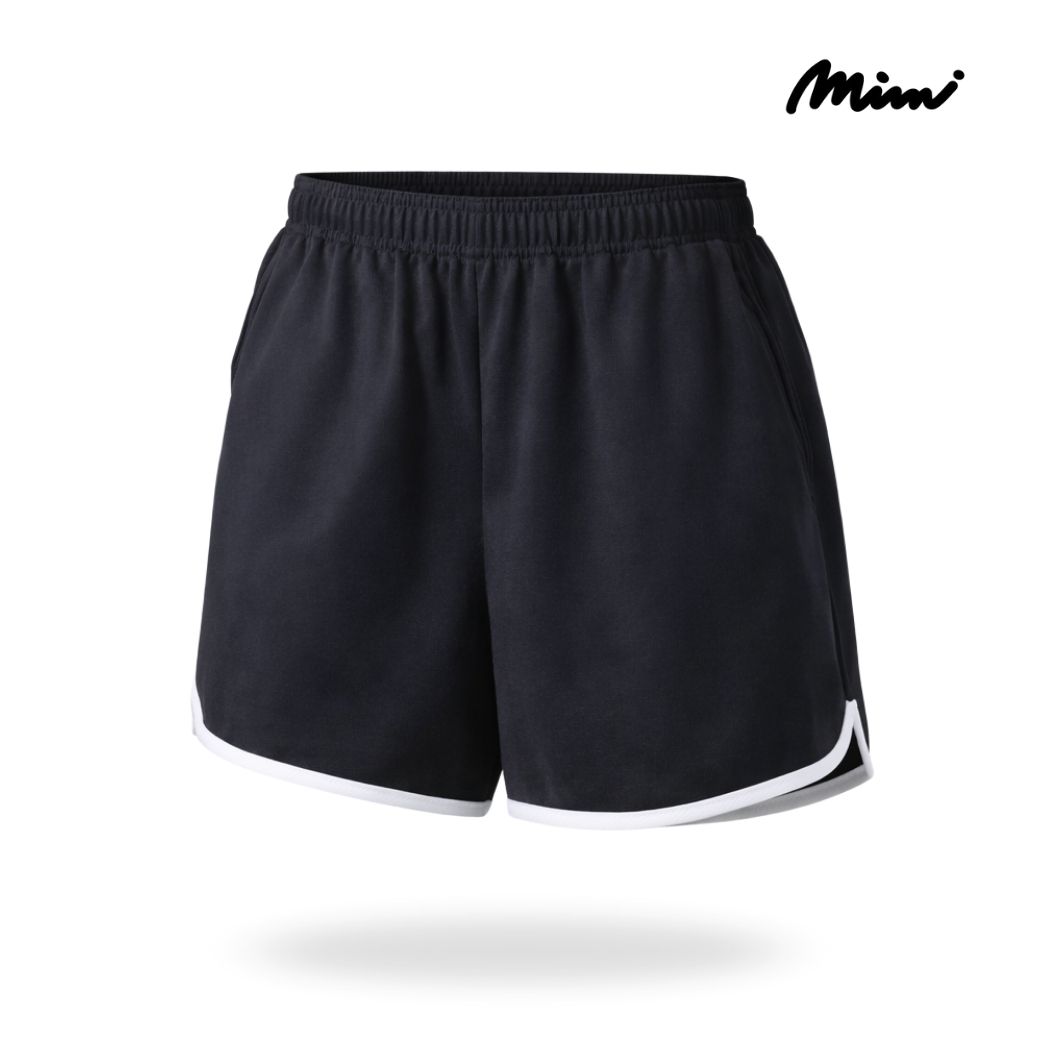 กางเกงขาสั้นผ้ายืด ขอบเอวยางยืด กุ๊นลายขาสีขาว และแต่งเทปพิมพ์ MIMI ด้านข้างปัก MIMI ปลายขาด้านซ้าย