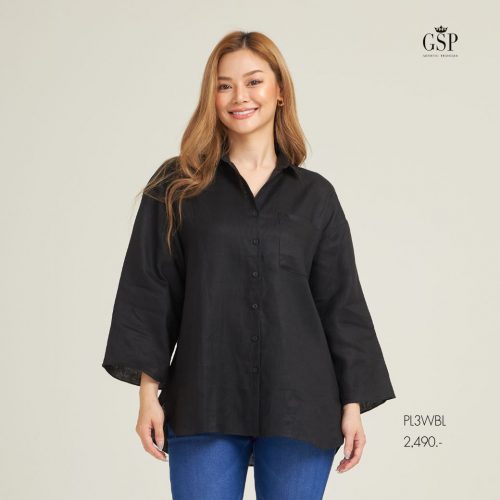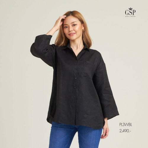 GSP LINEN BASIC SHIRT | เสื้อเชิ้ตสีดำ ผ้าลินิน ทรงหลวม Oversize ปลายแขนบาน PL3WBL